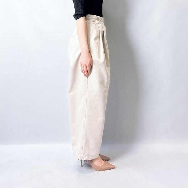 しっかりとったタックとバレルシルエットで立体感を出し、エレガントモードなチノパンに。