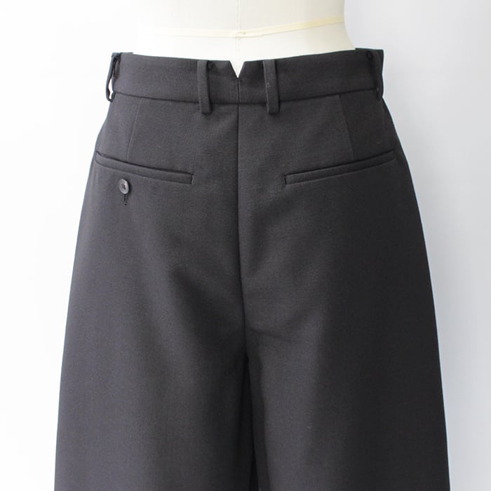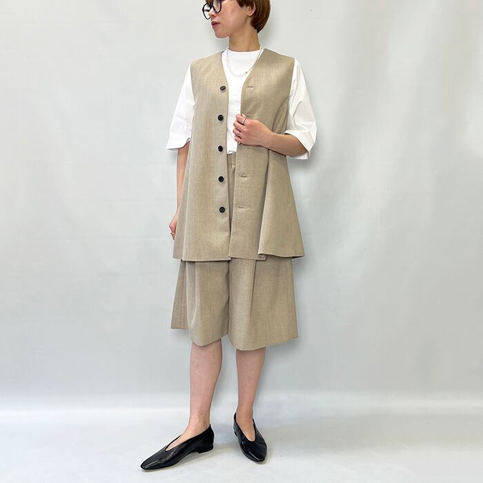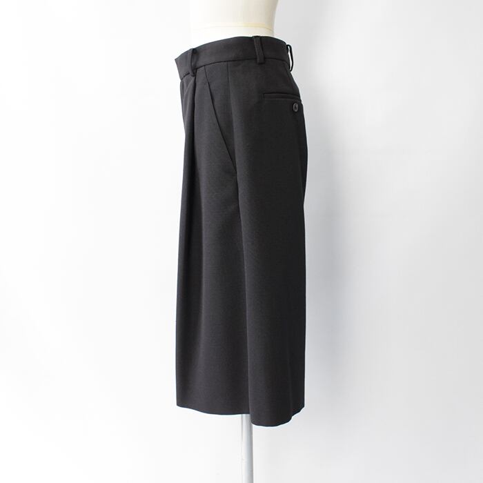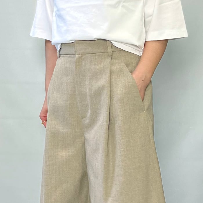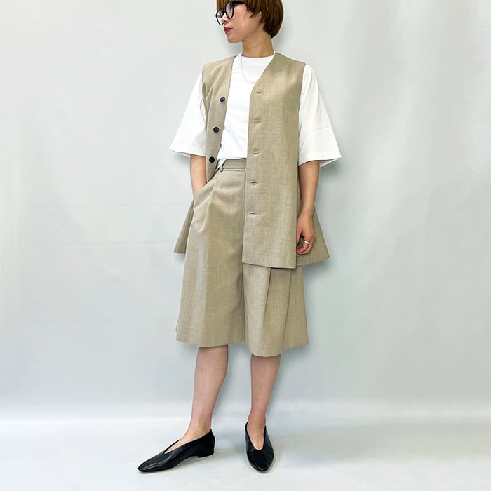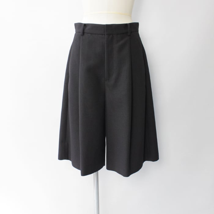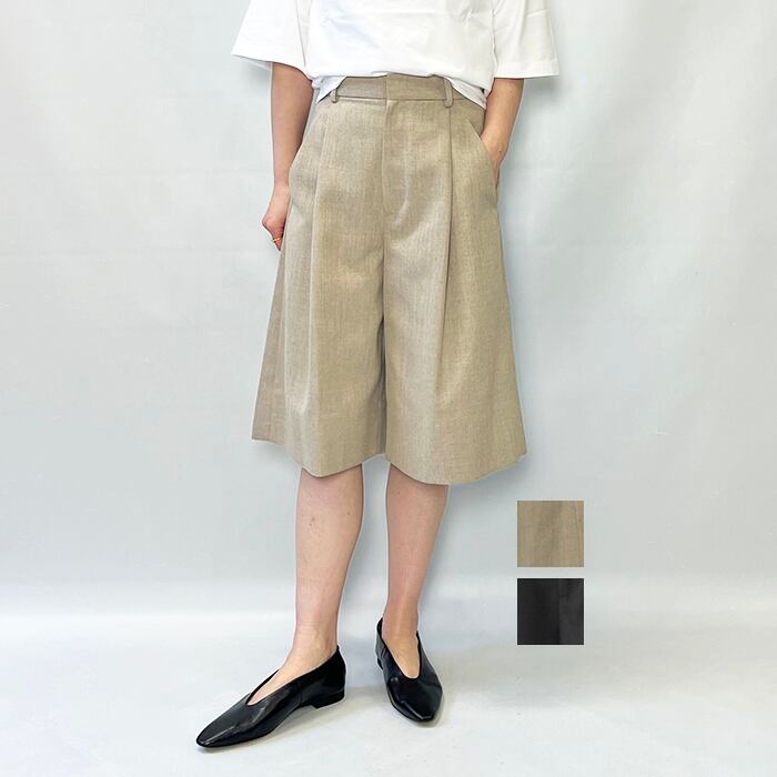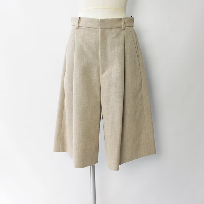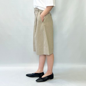 タックフレアーで分量を出したAラインシルエットが新鮮な膝丈キュロット。