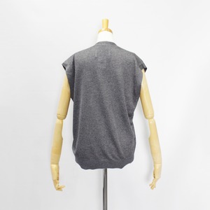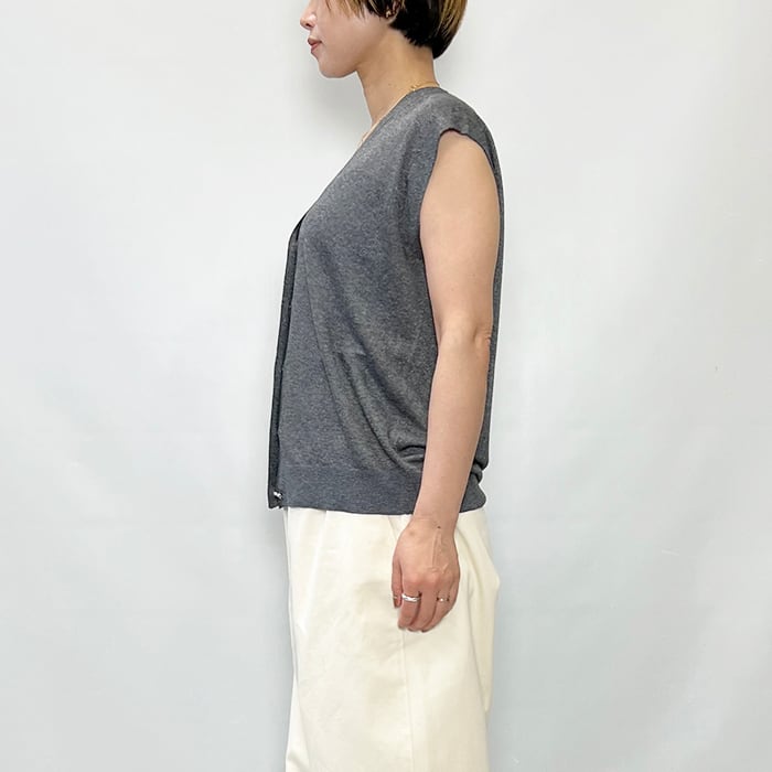 シルクタッチの素材を使用したニットベストは、肩が隠れるほどの絶妙な袖丈で暑さ残る時期から着用可能。
