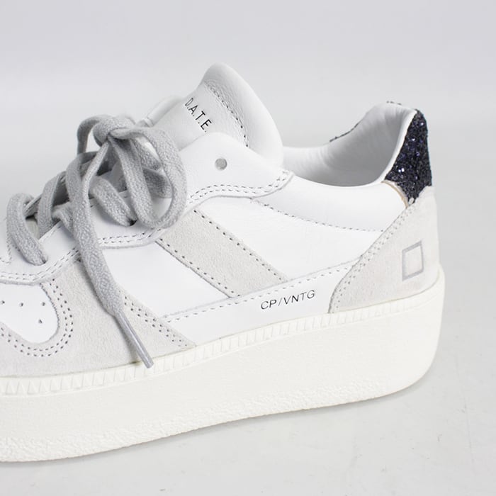 ホワイトレザーにシルバーメタリックのヒールパッチでアクセントを加えたモダンなデザイン。