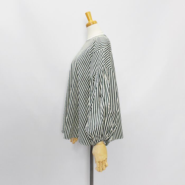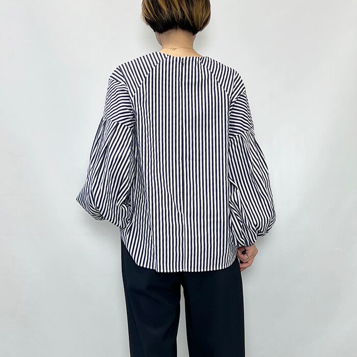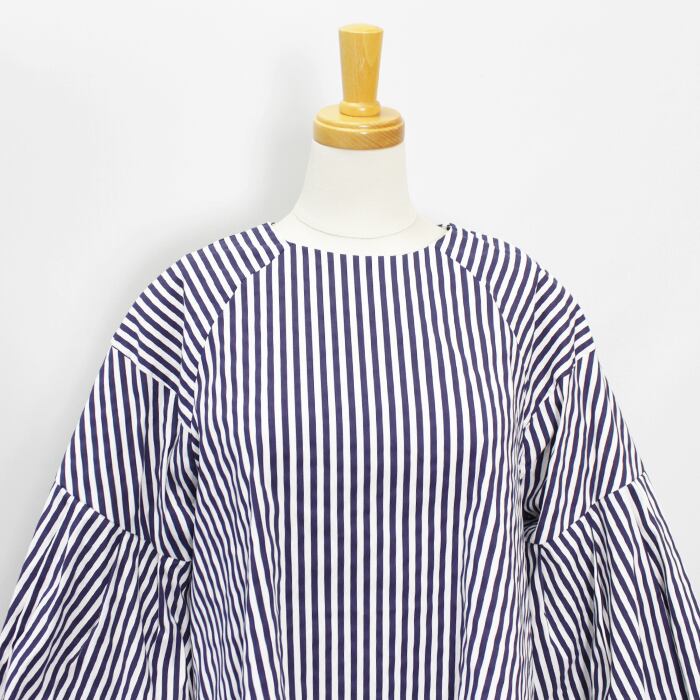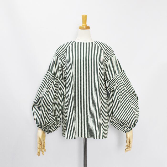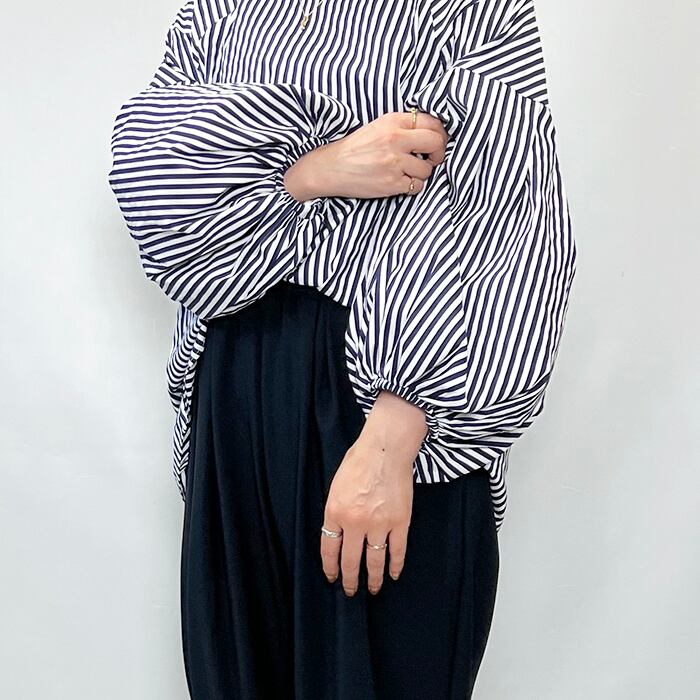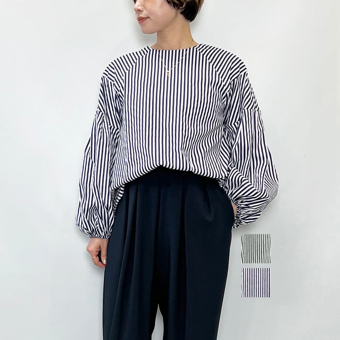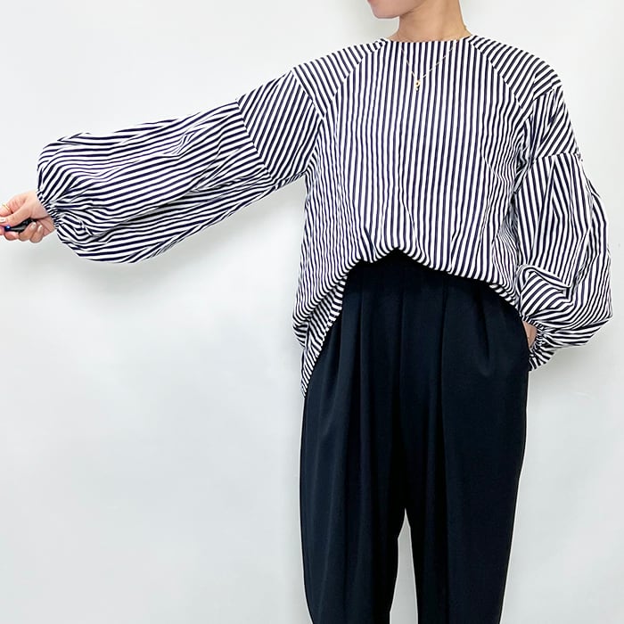 爽やかなストライプが目を惹くボリュムスリーブブラウス。