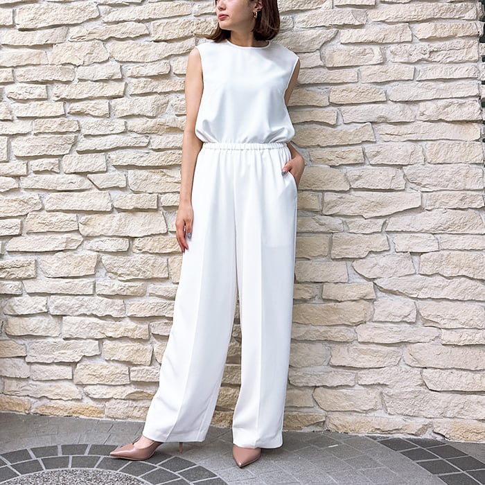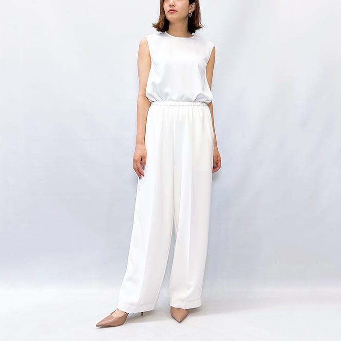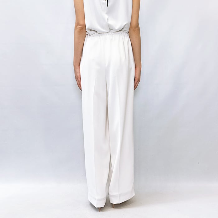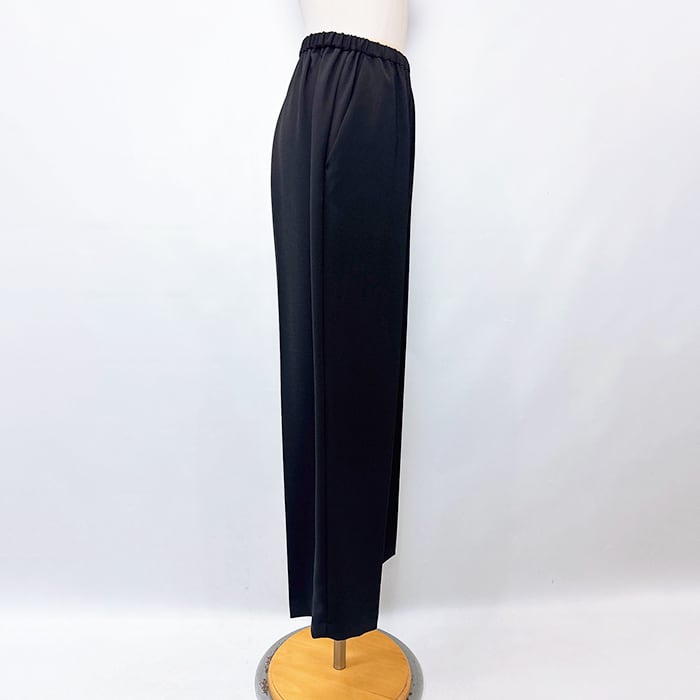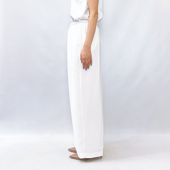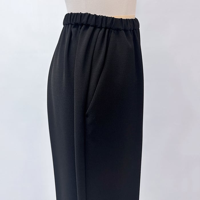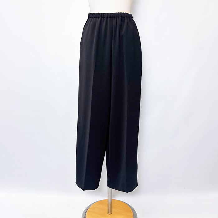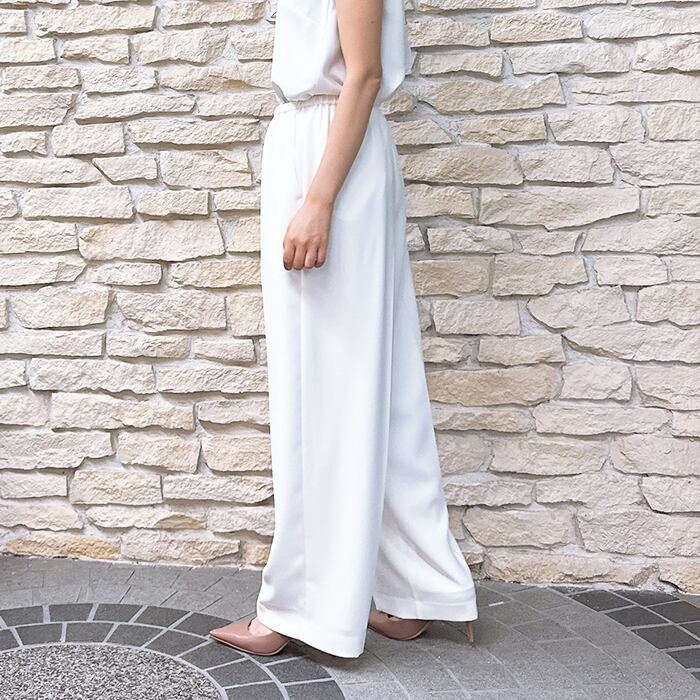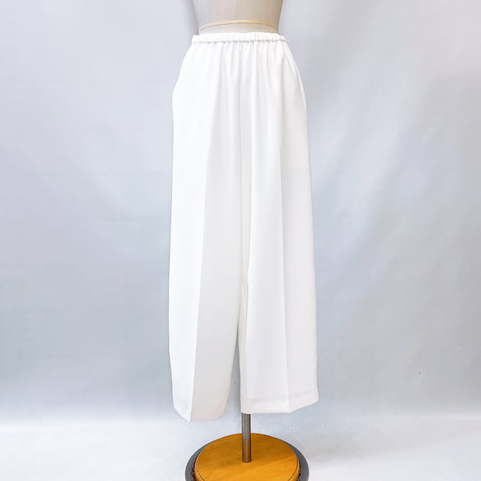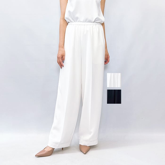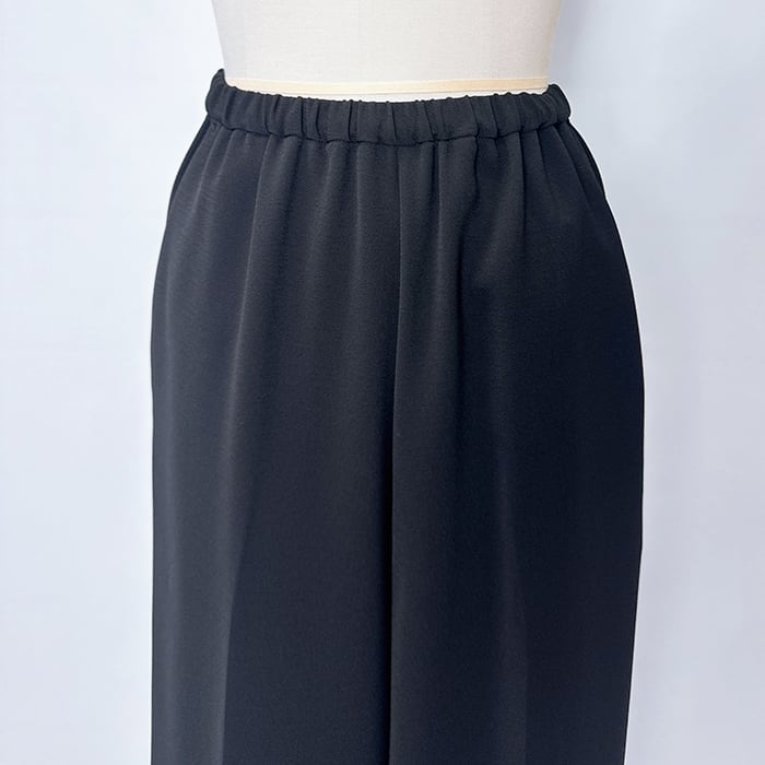 落ち感ある綺麗なジョーゼット素材を使用しセンタープレスをする事でウエストオールゴムでもラフ過ぎず上品な印象に。
