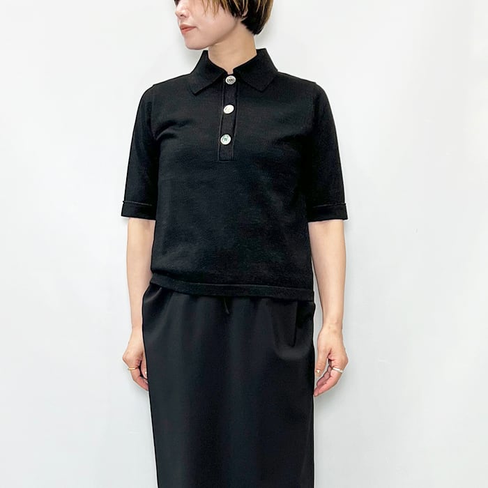 滑らかな肌触りの14Gラメ混ウール素材を天竺に編み立てたポロ・ニット。