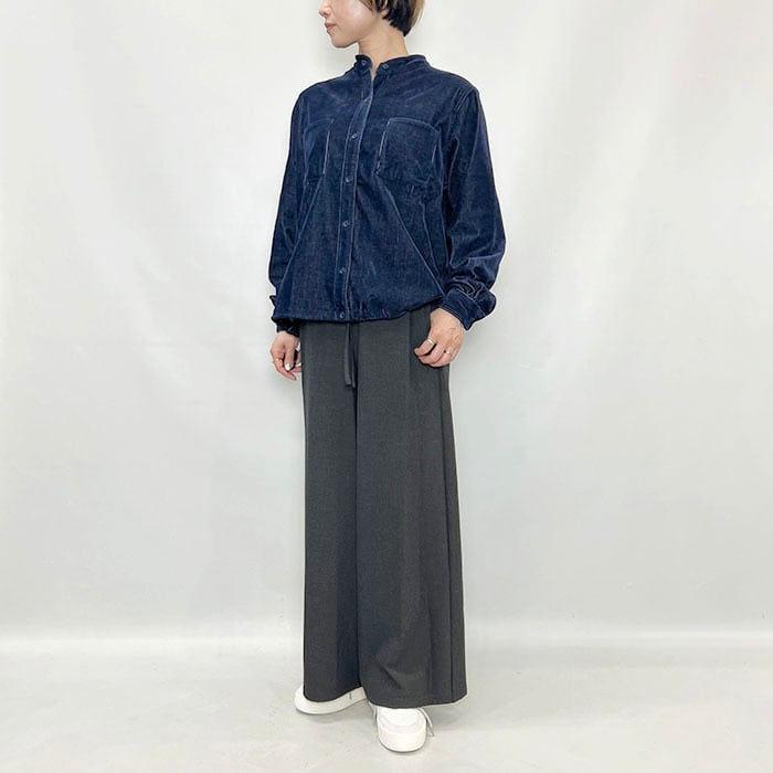 柔らかく光沢のあるコーデュロィ素材を使用することでギャザ―部分にとろみと陰影がでて上品な表情がでます。