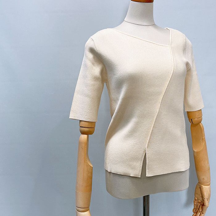 首元のアシンメトリーネックラインとリブの切り替えスリットで