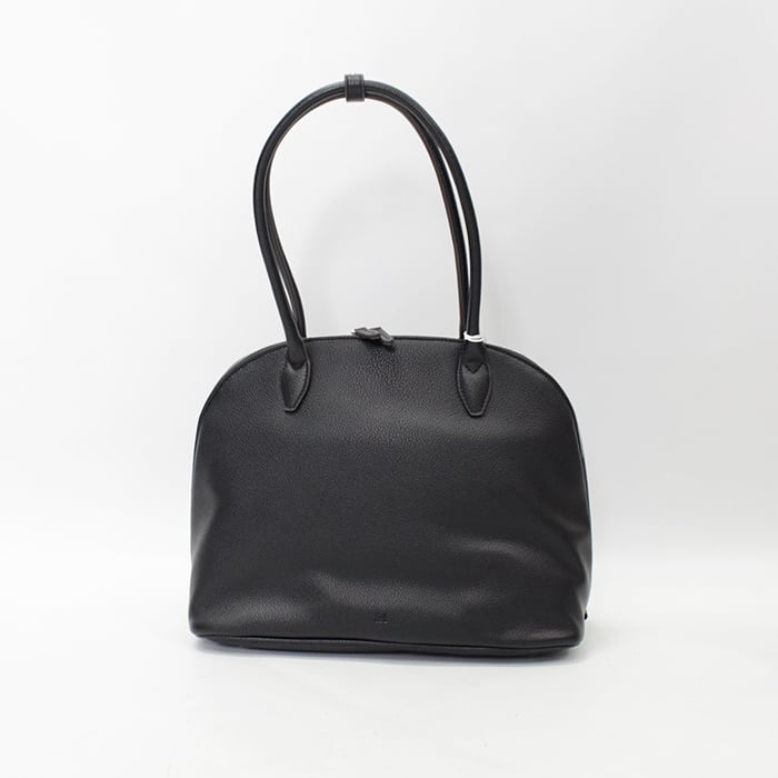 なめらかな質感のフェイクレザーを使用し、丸みと直線を組み合わせたシルエットが目を引くトートバッグ。