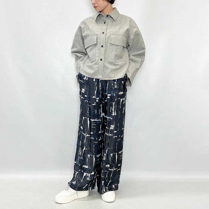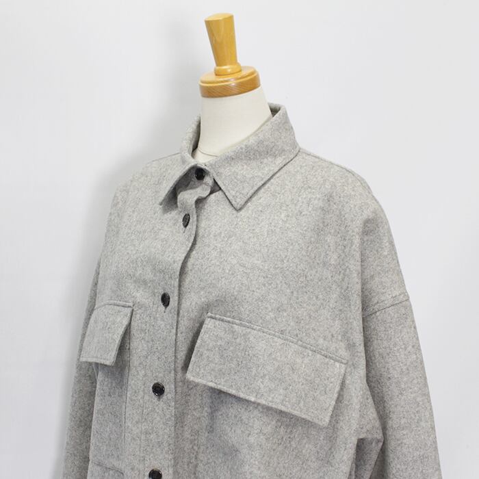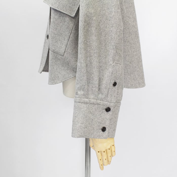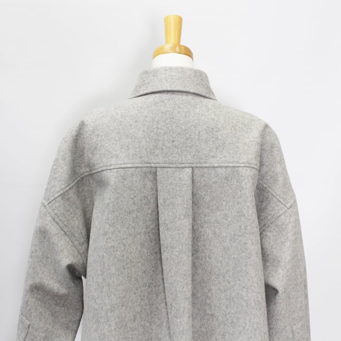 先染ウールならではの独特なメランジ感のある表情が特徴的な強圧縮フラノ素材を使用したクロップドシャツジャケット。