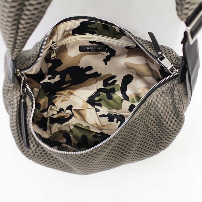 ショルダーのつなぎ目パーツやファスナーの引き手には革を使い、