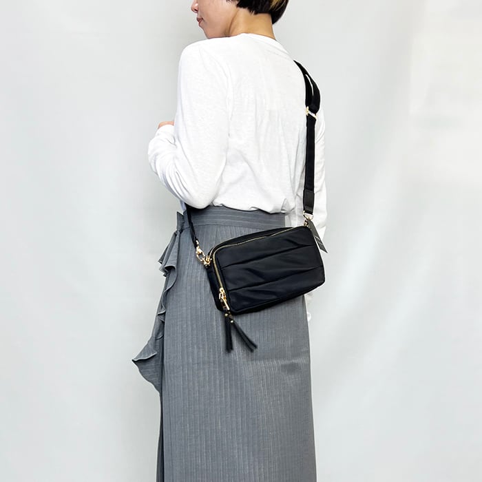 カジュアルになりがちなナイロンバッグもプリーツデザインと金具使いで上品にお持ちいただけます。
