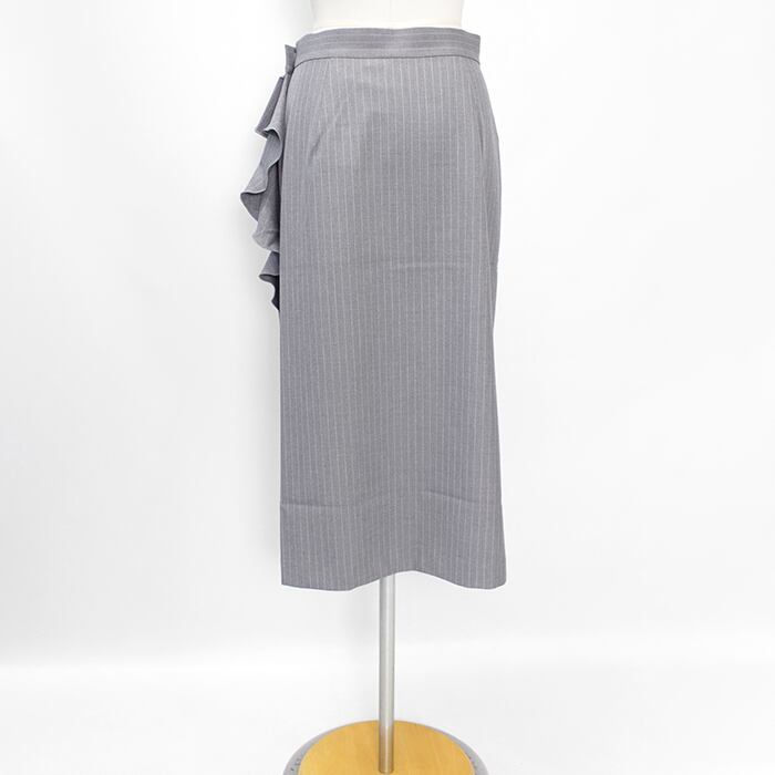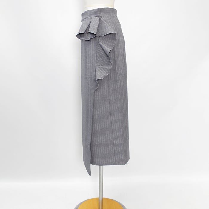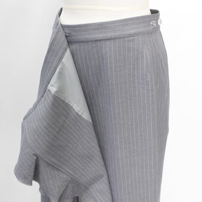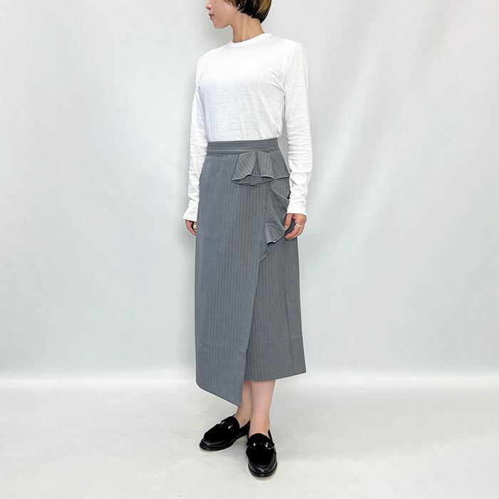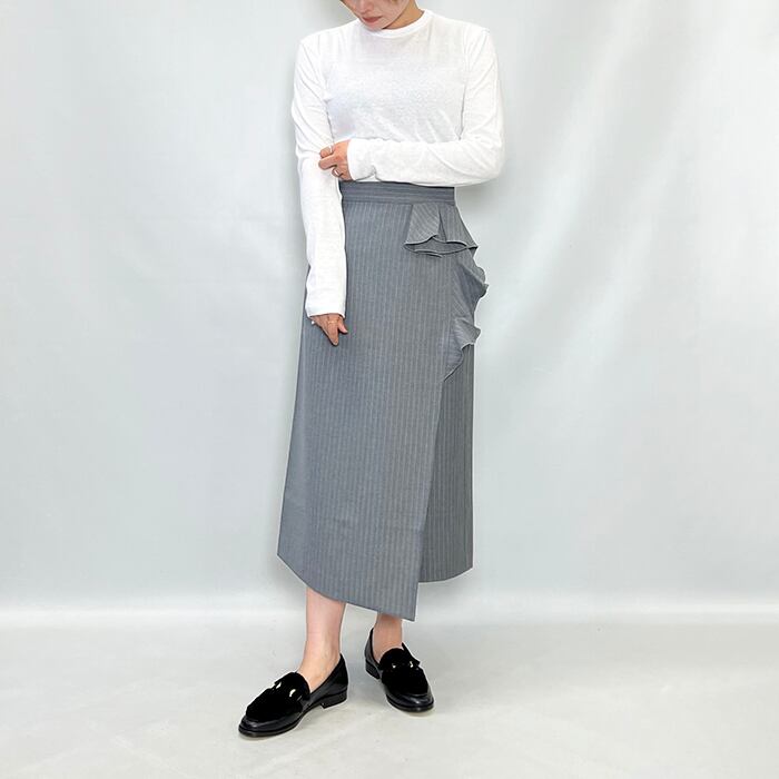 クリーンな表面感と暖かみのあるソフトな風合い仕上げが特徴のピンストライプ柄モチーフ・ラップスカート。