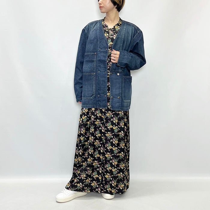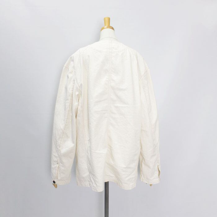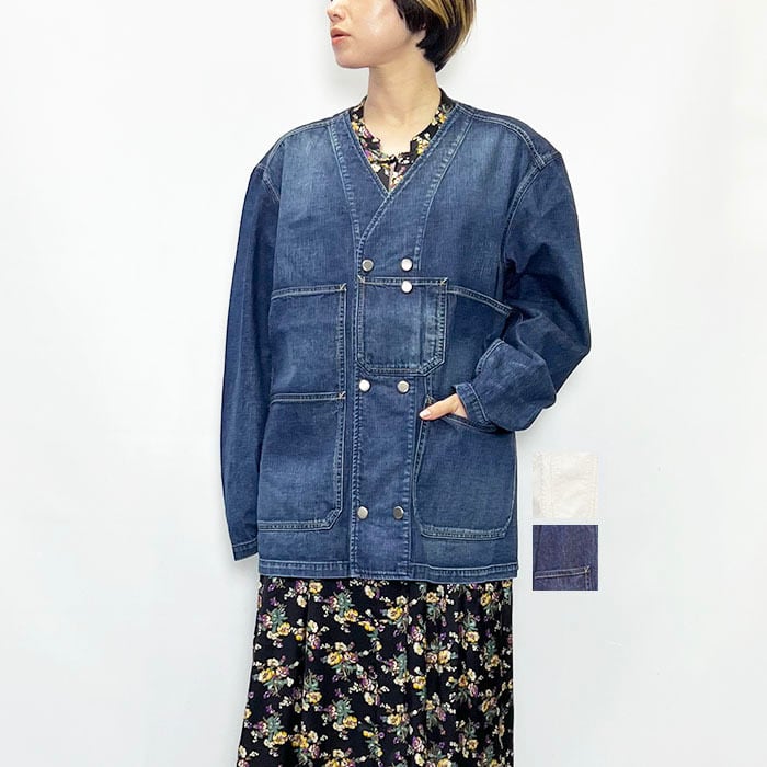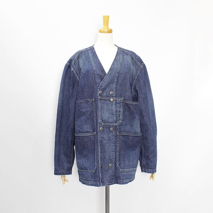 9番手のムラ糸を使用した8.5ozのデニム生地による軽やかで柔らかなノーカラーのカバーオールジャケットです。