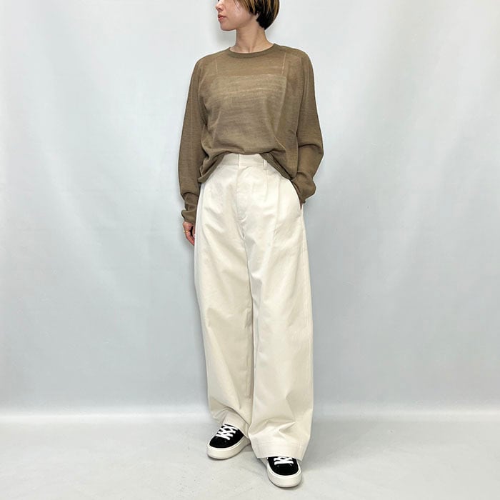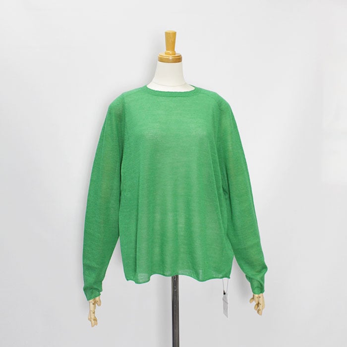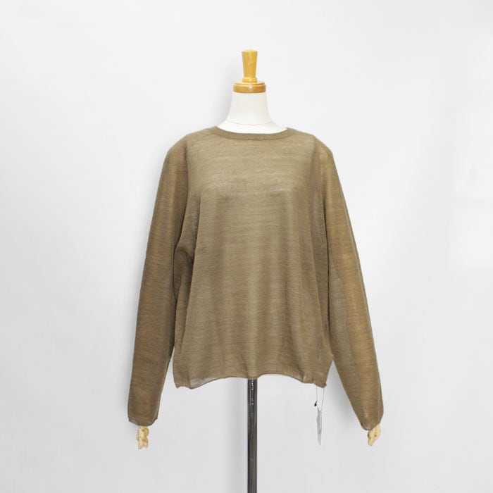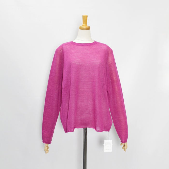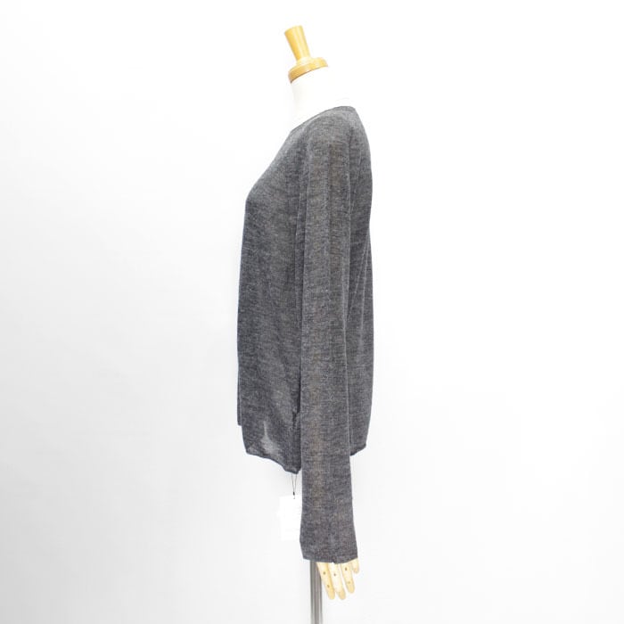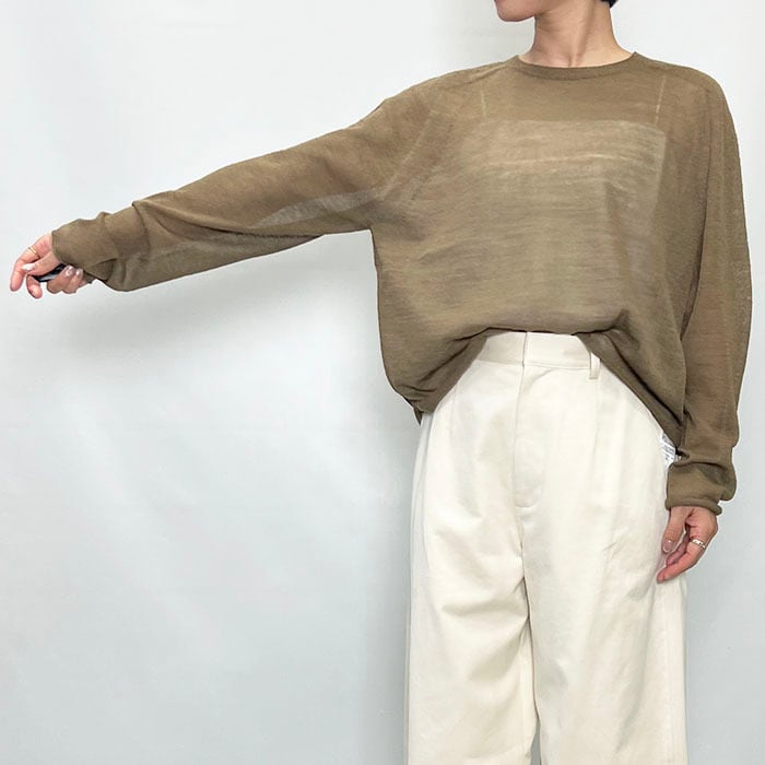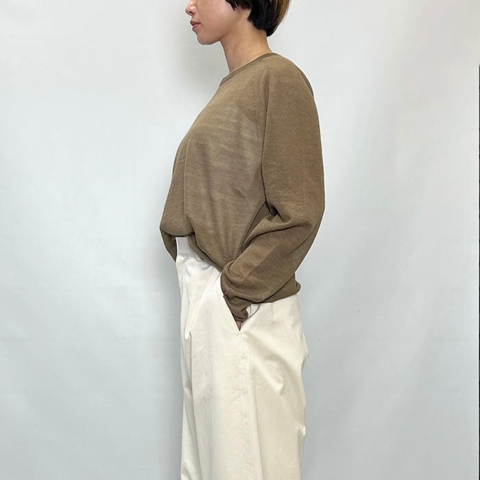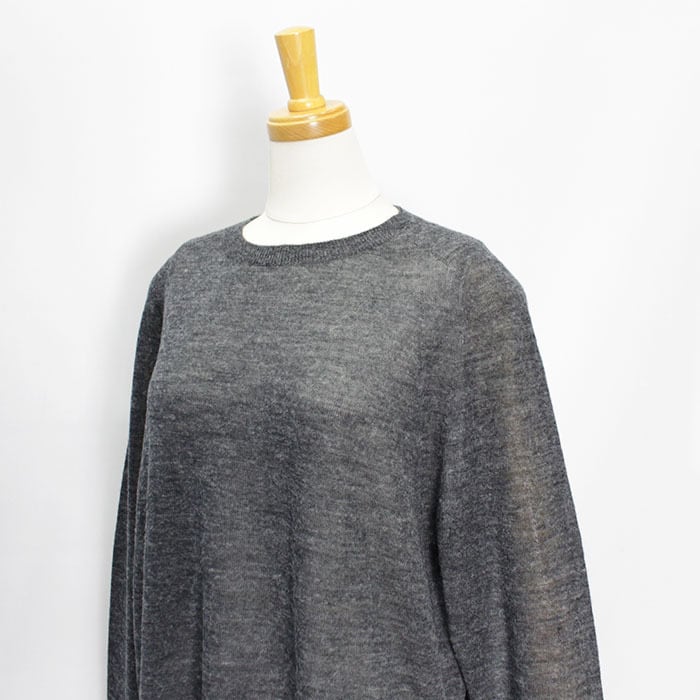 アルパカのみでは表現の難しい細くシアーなイメージに15L天竺ホールガーメントで編み立てました。