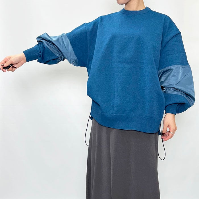 定番のニット素材にミリタリーテイストのナイロン素材を組み合わせることで、よりラフな印象をプラスしました。