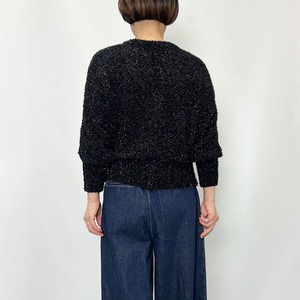 光が当たるたびにキラキラと輝くラメ糸入りの糸で織り上げたニットです。