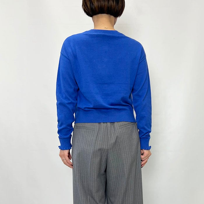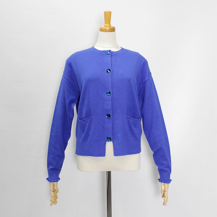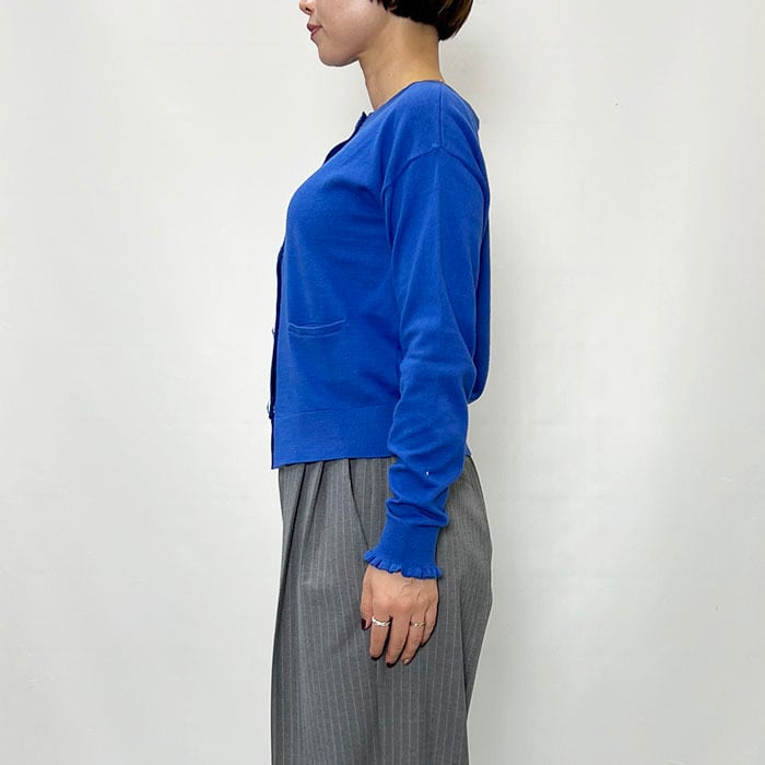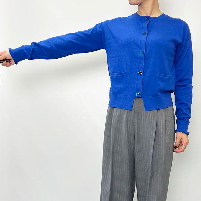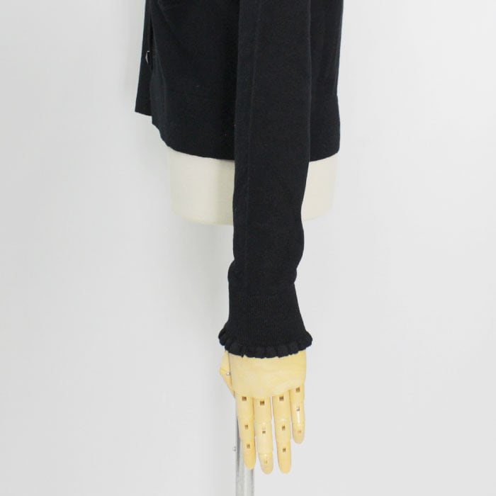 ブラウスの上に羽織りやすいサイズ感と袖口の小さなフリルがポイントです。