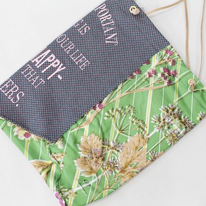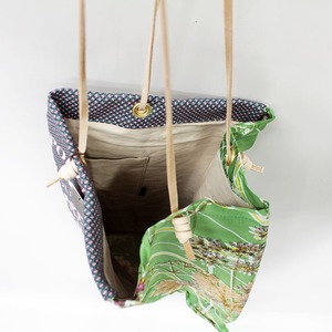 シルクスカーフの柄と、織り柄の生地に刺しゅうを施したmanipuri定番のトートバッグ。