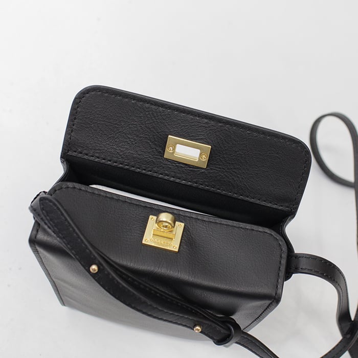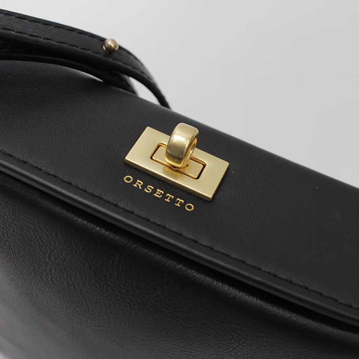 開口部はフラップ式で、ORSETTOのアイコン的ヒネリ金具とロゴを配しています。