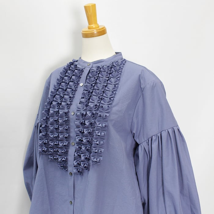 特殊ミシンで施すバイヤスタックフリルは密度を高めてより華やかで、