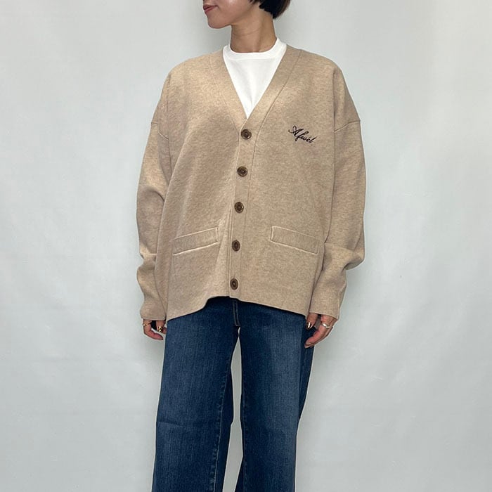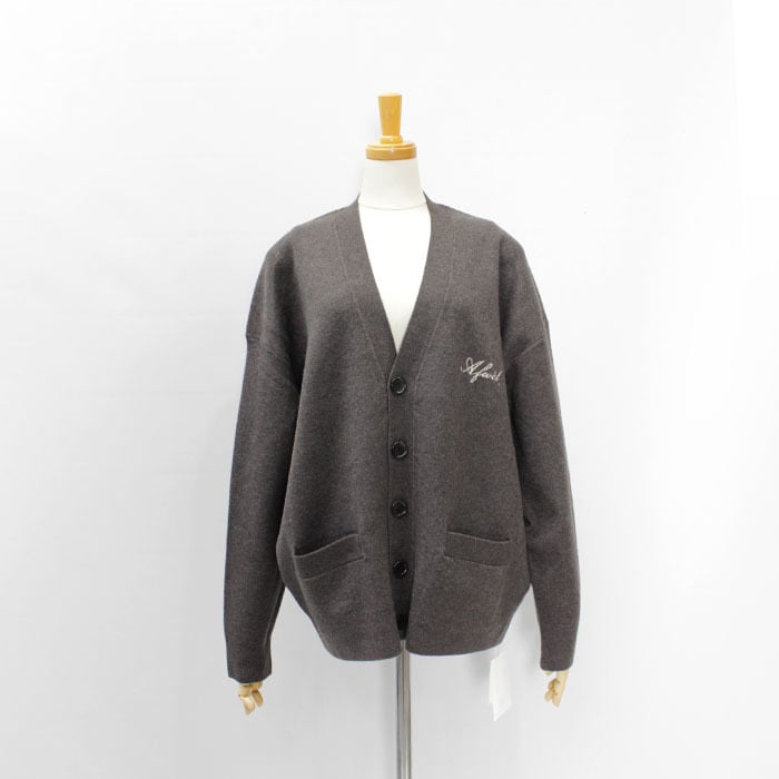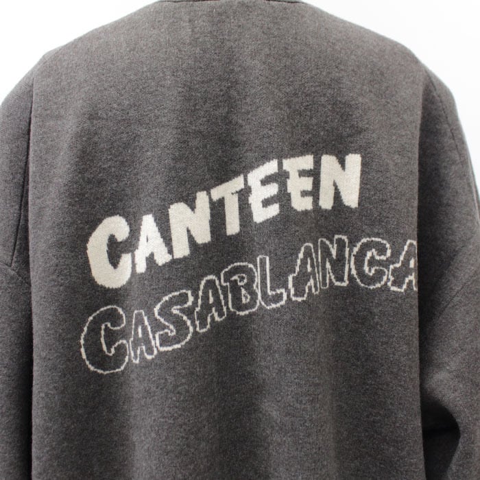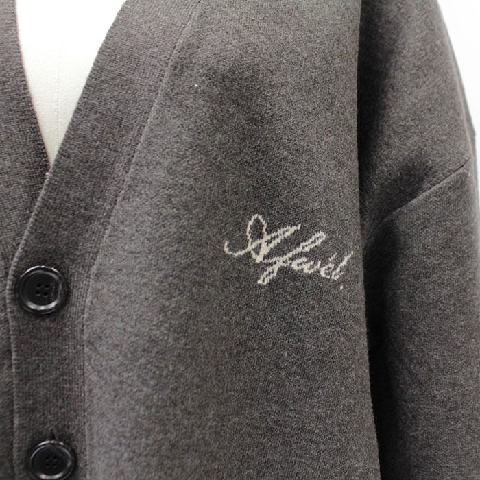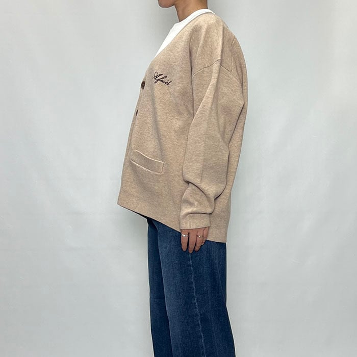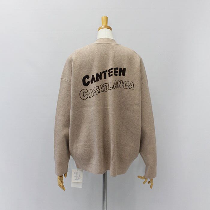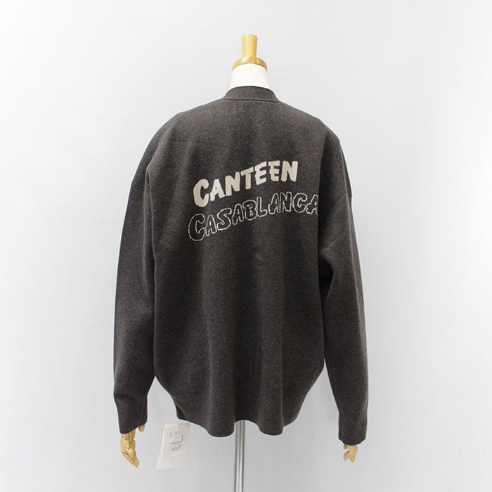 フロントはシンプル、バックには大胆なロゴデザインが施されたカーディガン。