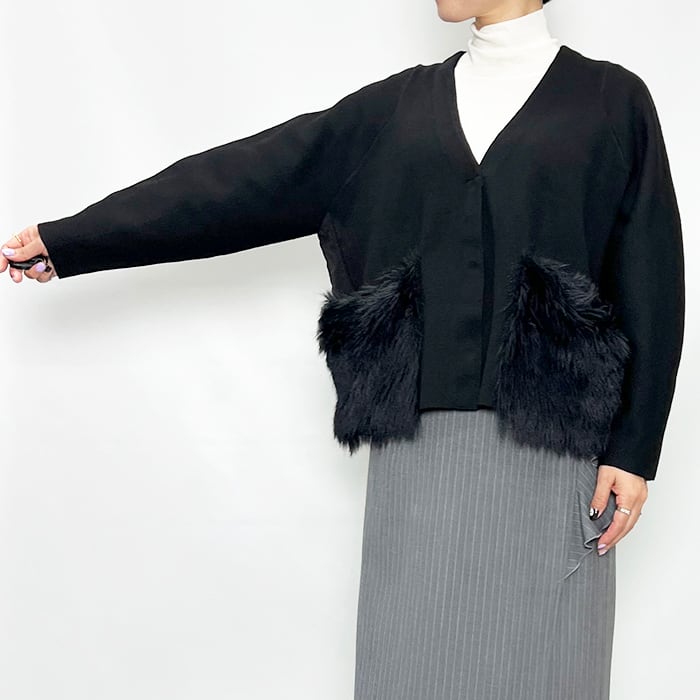 ウール・ポリエステル素材をミラノリブに編み立て、大きめシャギーポケットがアクセントのコクーンシルエットニットジャケット。