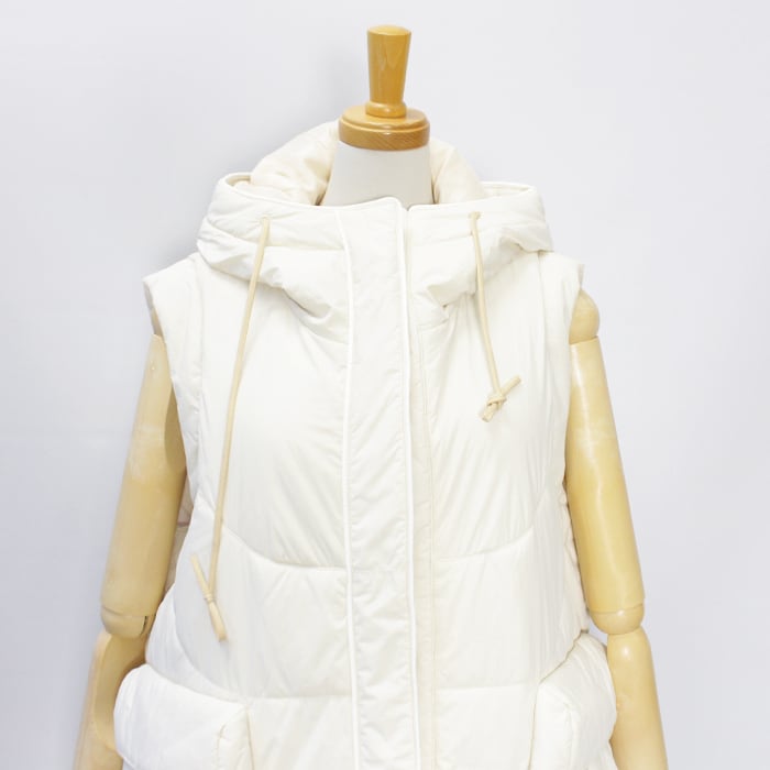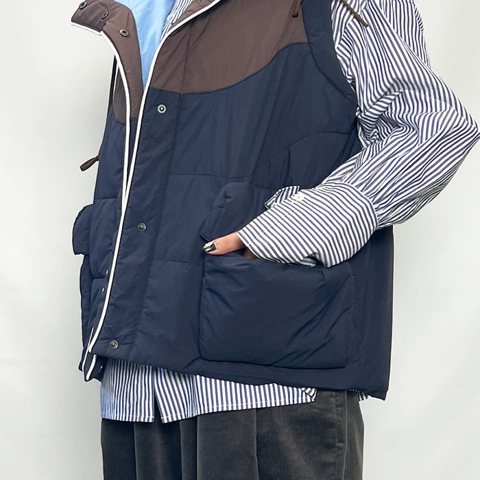 HeRIN定番の形のデイテールを変化させたバイカラーのベスト。