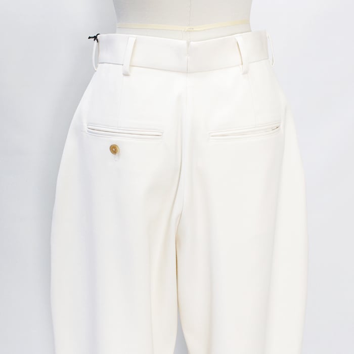 表はすっきりとした表面感で裏は肌あたりがよく、膨らみとハリを兼ね備えたキャバリーツイルのような目面の素材です。