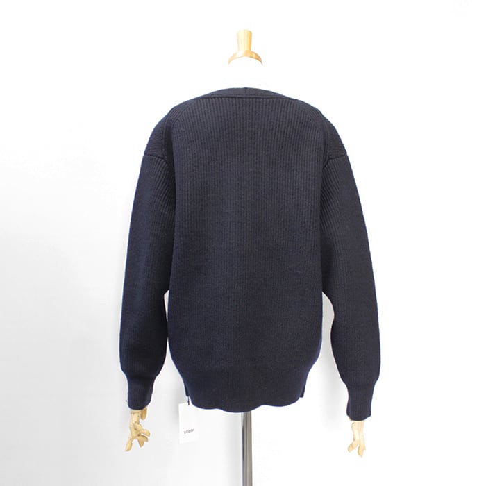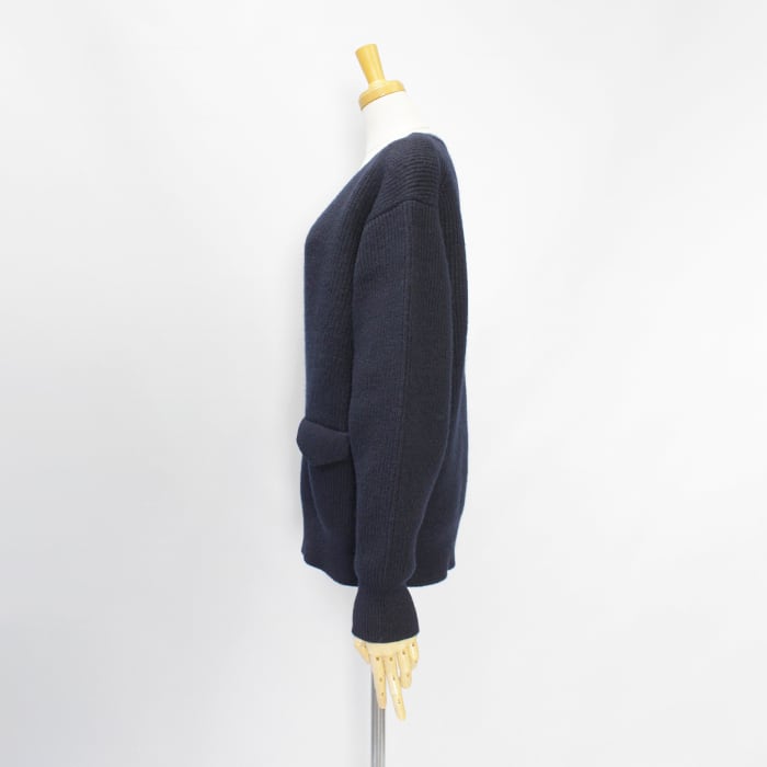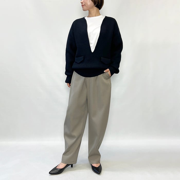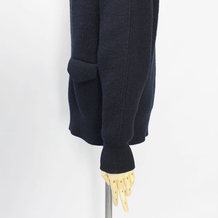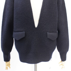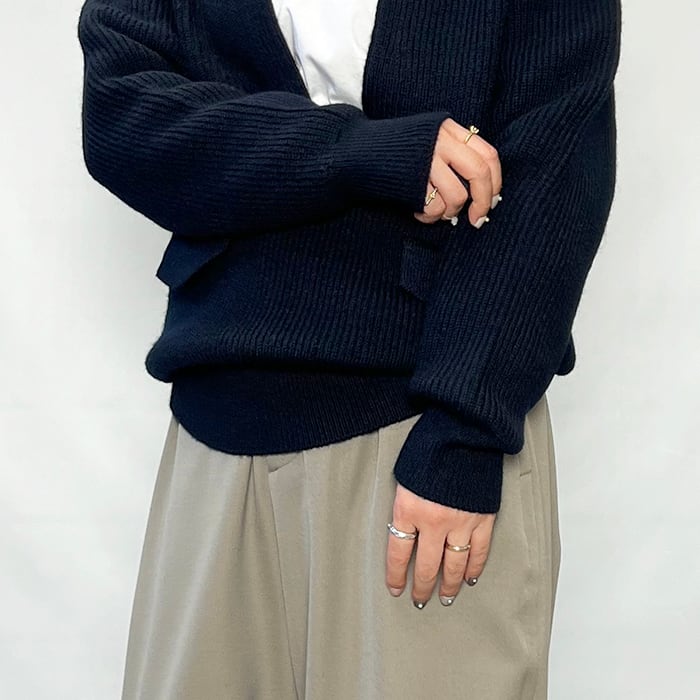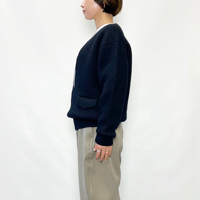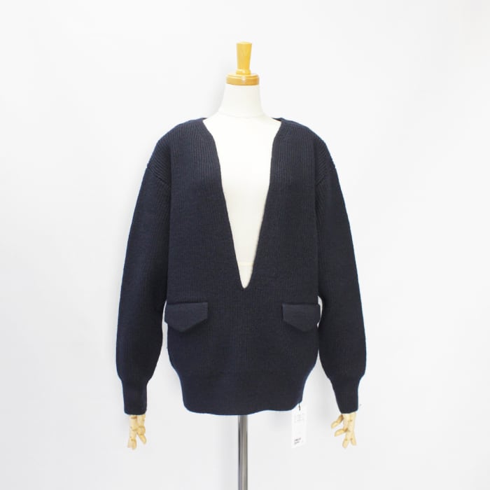 編み続きの胸元の深いスリットとフラップポケットがポイント