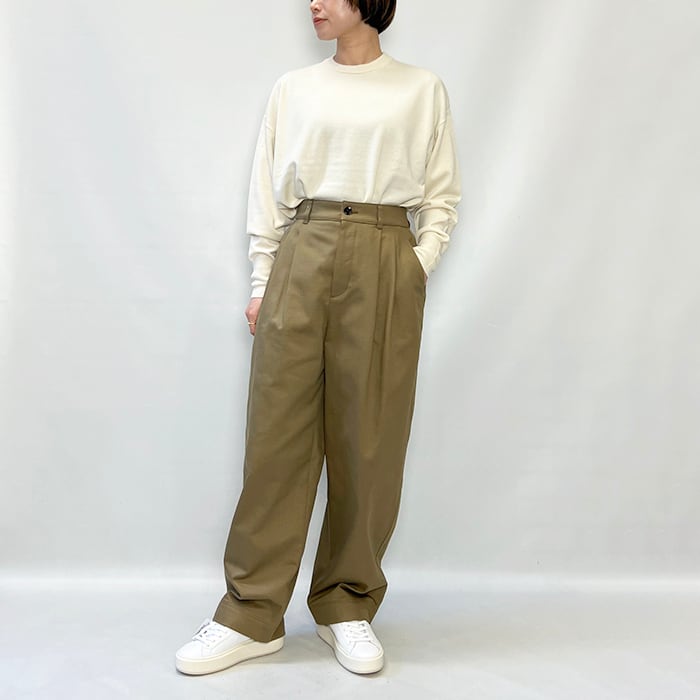 ほんのり丸みを帯びたカービーシルエットのワイドパンツはモードカジュアルな雰囲気に。