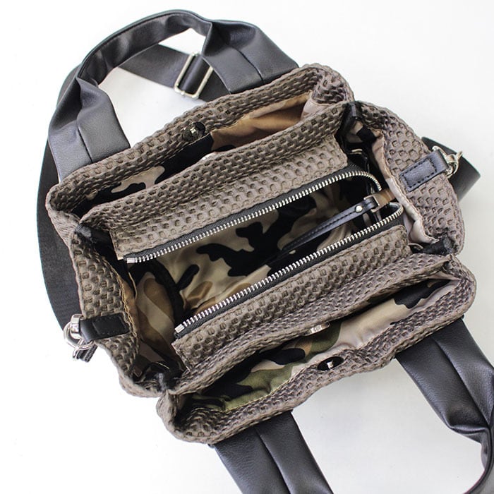 たっぷり入るメインの中央はファスナー開閉、前と背側はマグネット開閉と