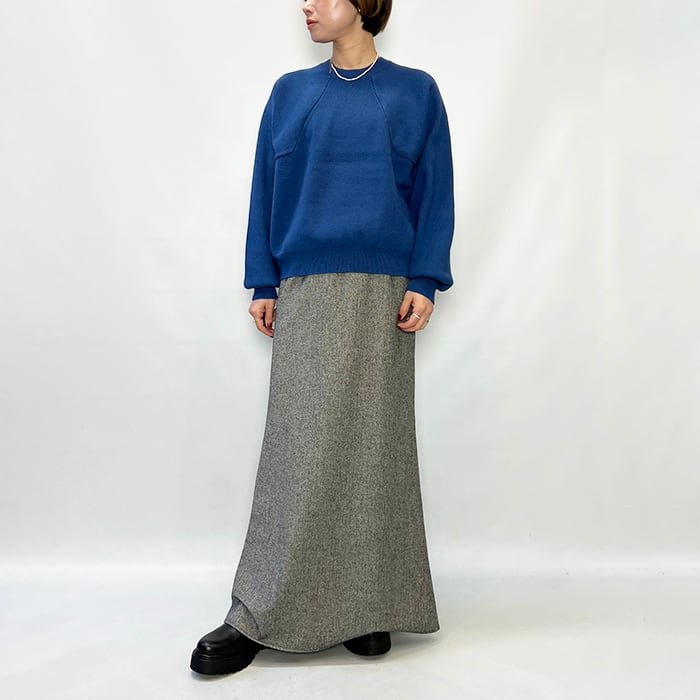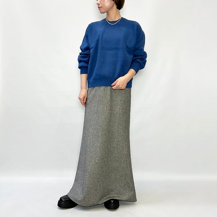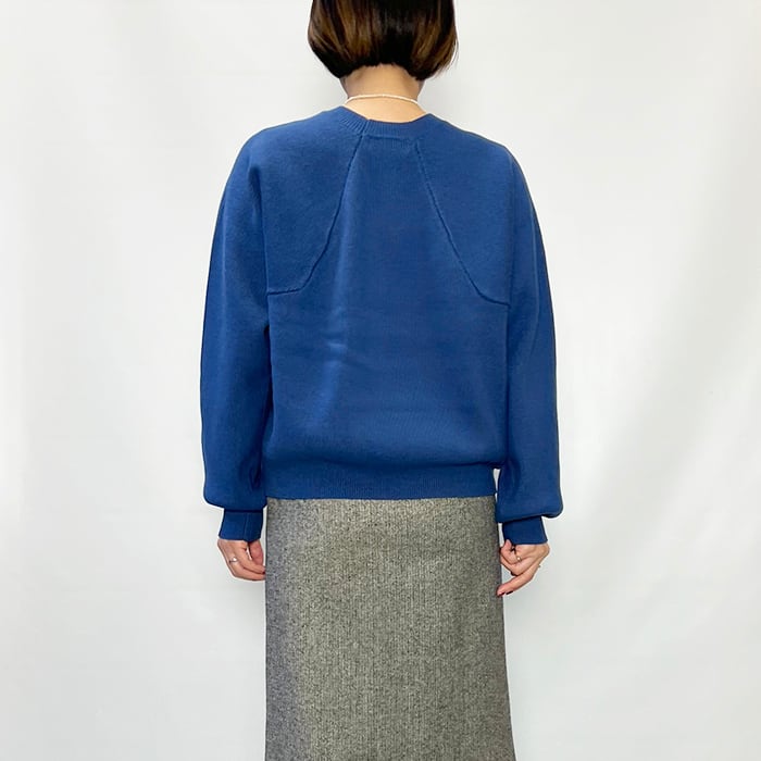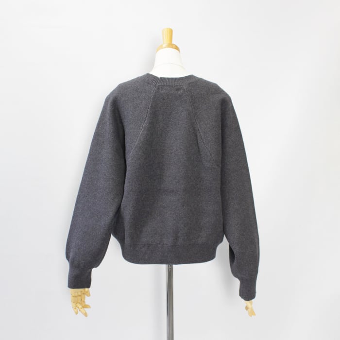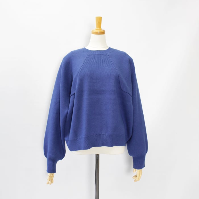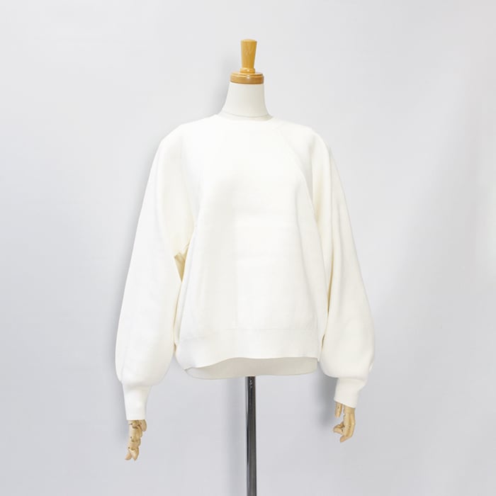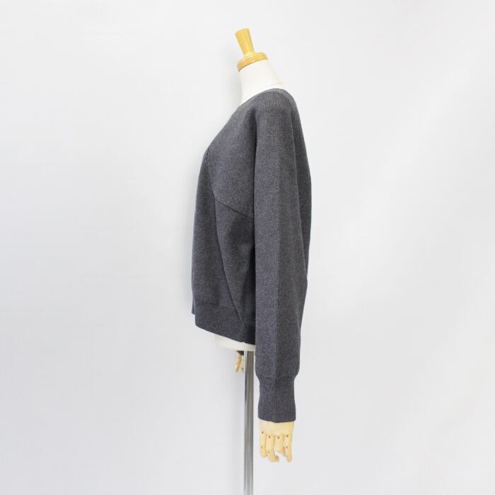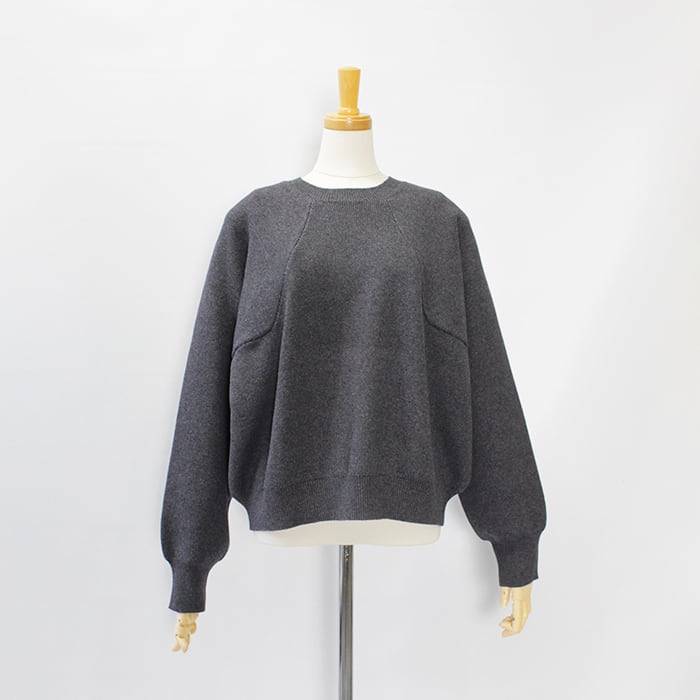 やや肉厚でハリのある総針編みで仕立てたニットトップス。