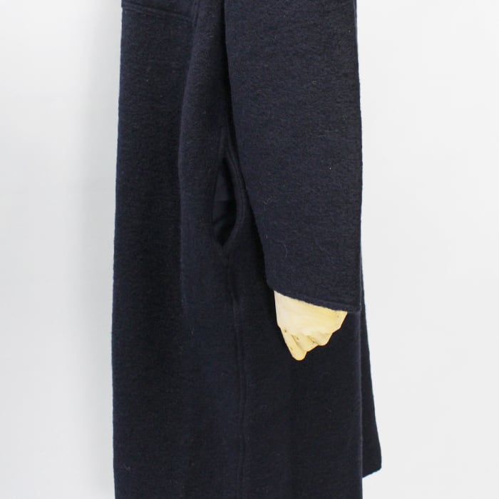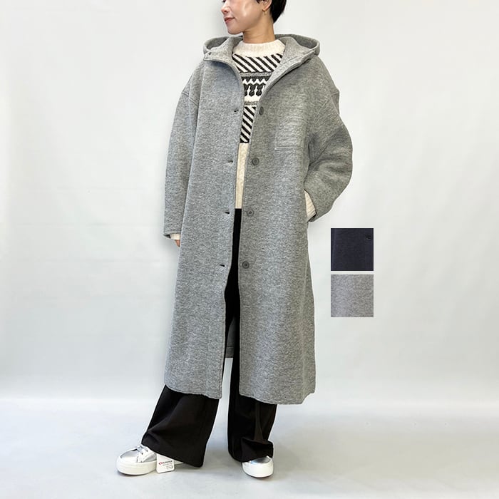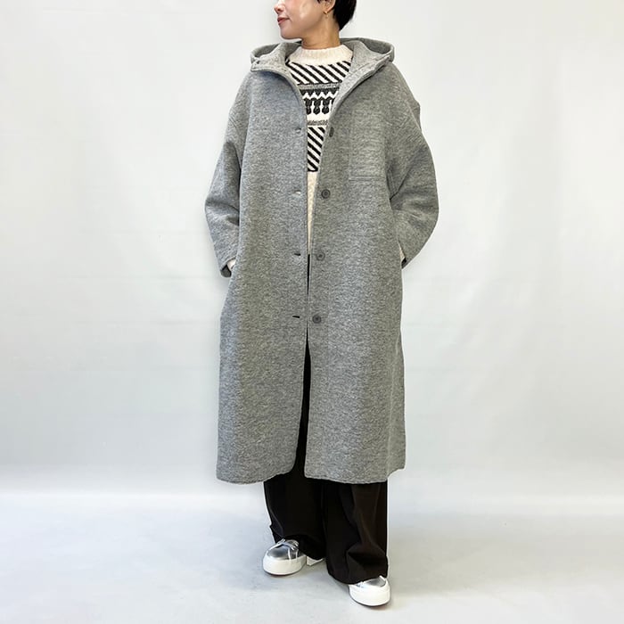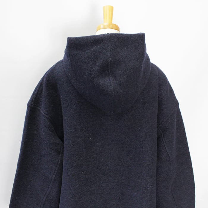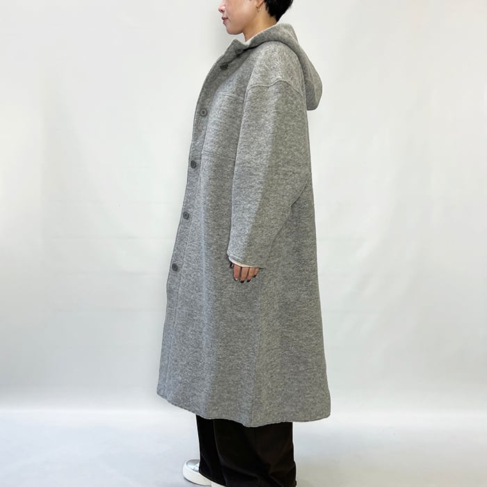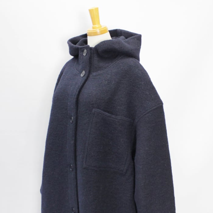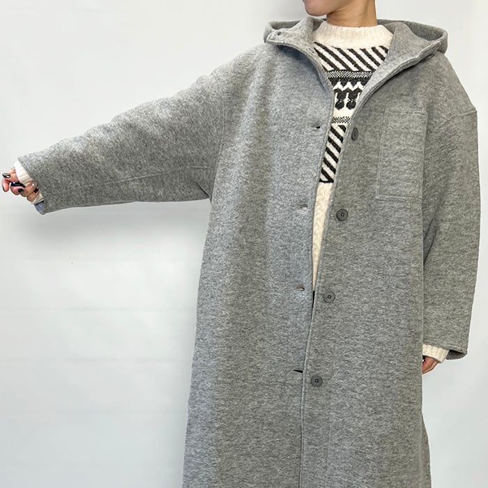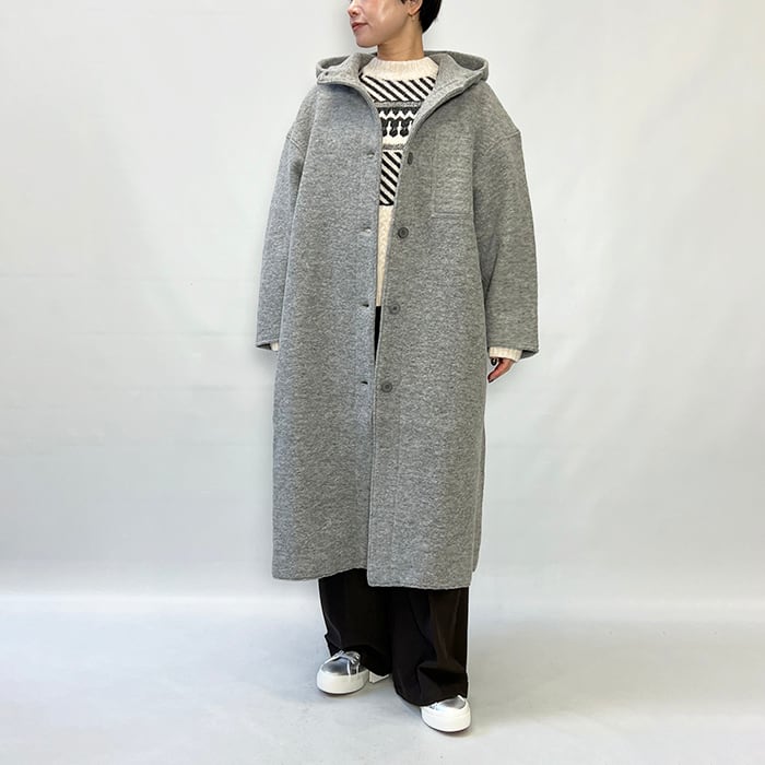 フードが立体的になるスタンドカラーと、柔らかく丸みのあるコクーンシルエットが落ちるとなく決まるデザインです。