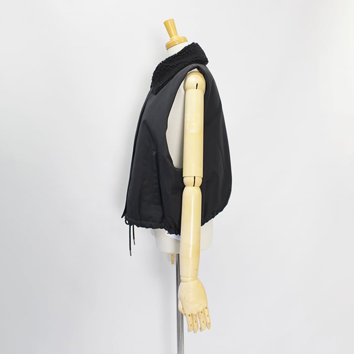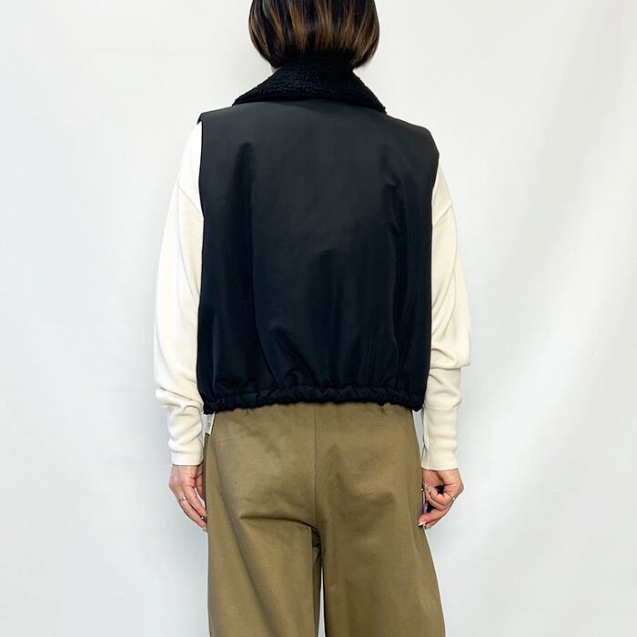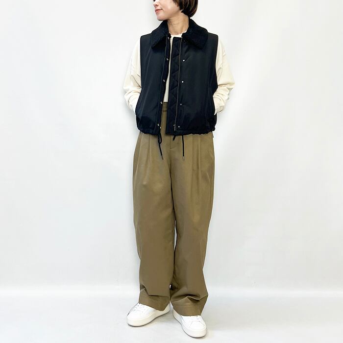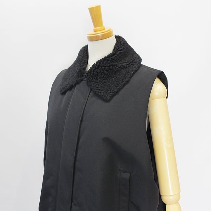 ウール混ボアの大きめの衿がリュクスなアクセントに◎。