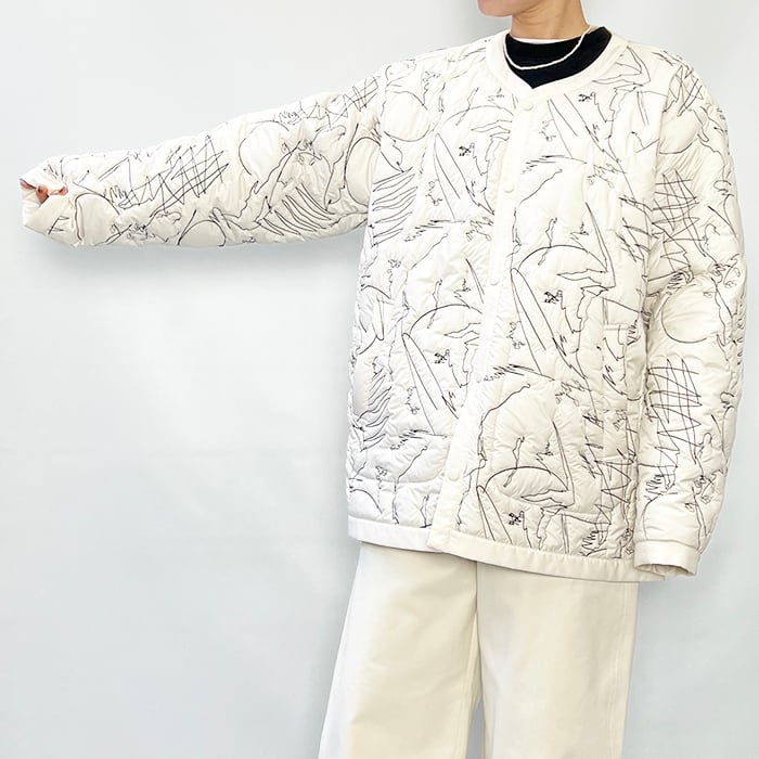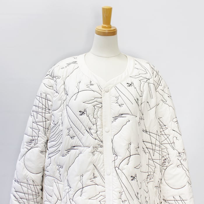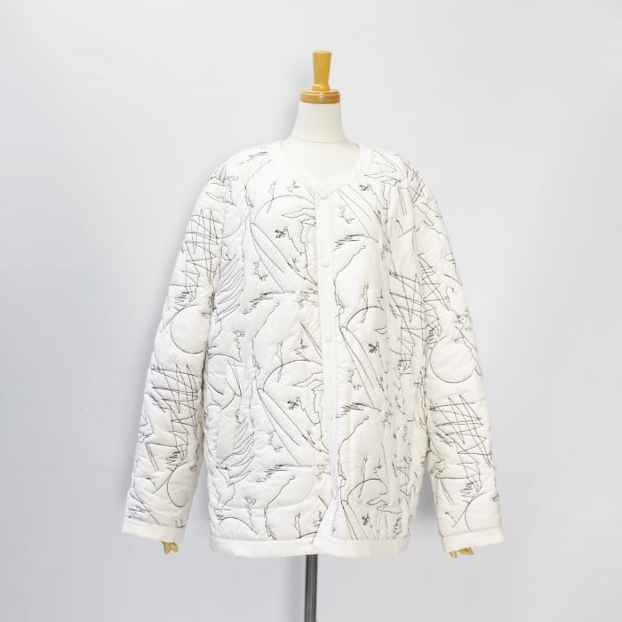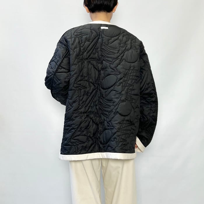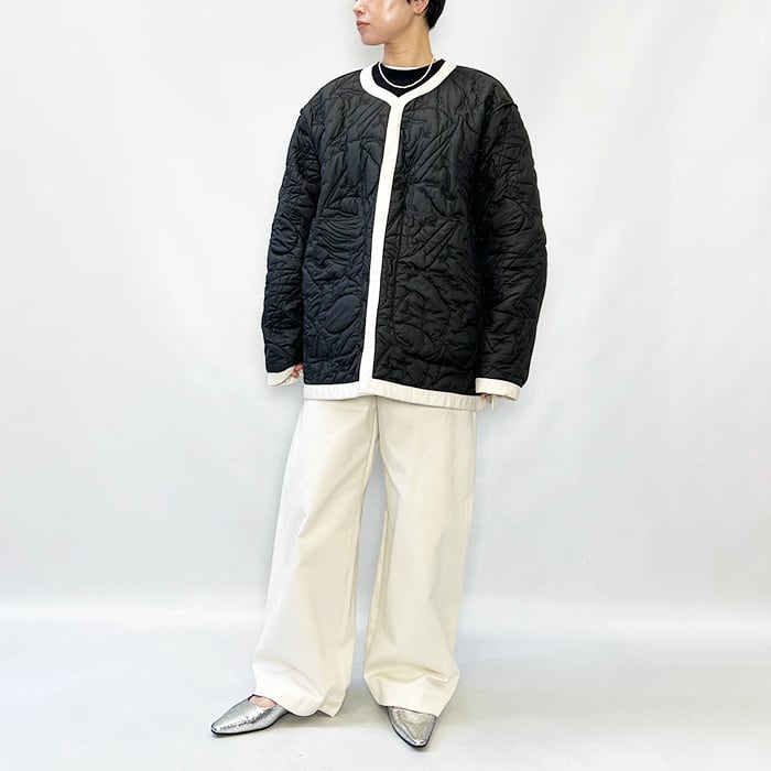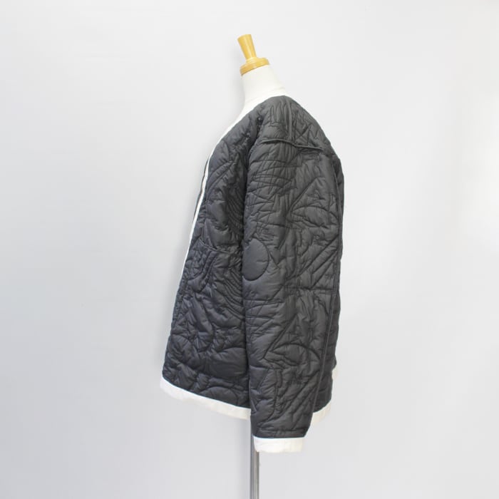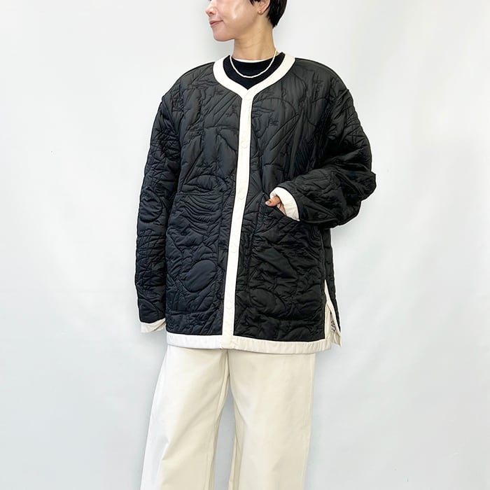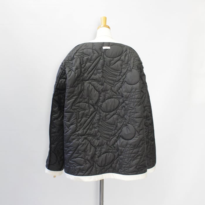 ノーカラーのリバーシブルのキルティングジャケット。