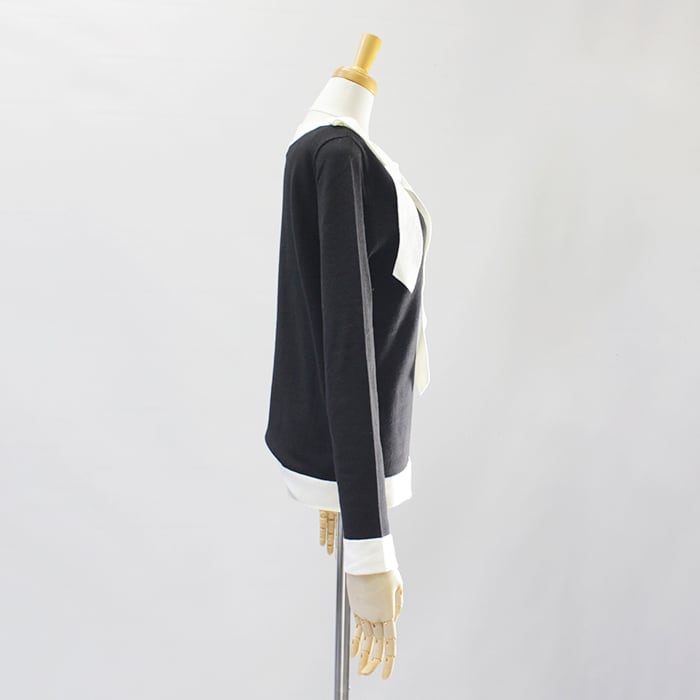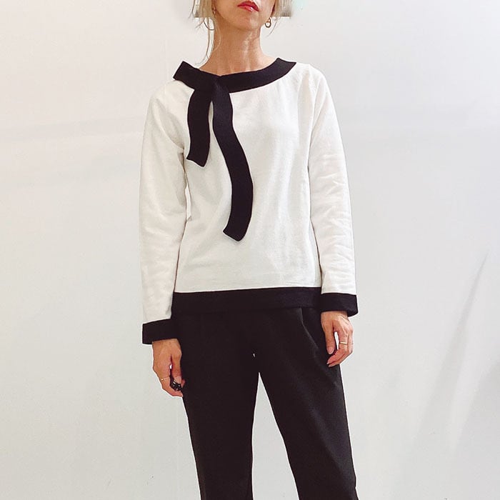 女性らしいボートネックラインに、共糸で仕立てた配色リボンを添えることでシンプルな中に華やかさをプラスしました。