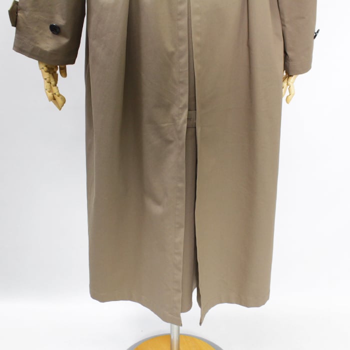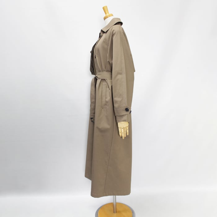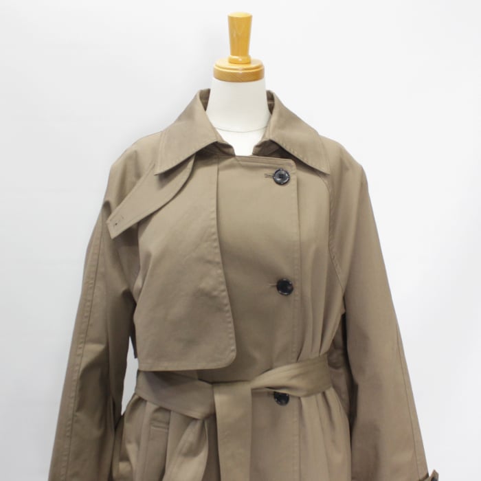 微光沢ある綾目の綺麗めな素材を使用したトレンチコートは女性らしくクリ-ンな印象。