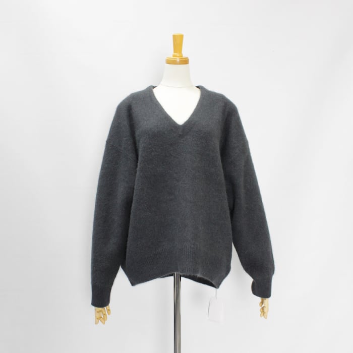 身体のラインを拾わない立体的なシルエットと、Vネックで抜け感を演出。