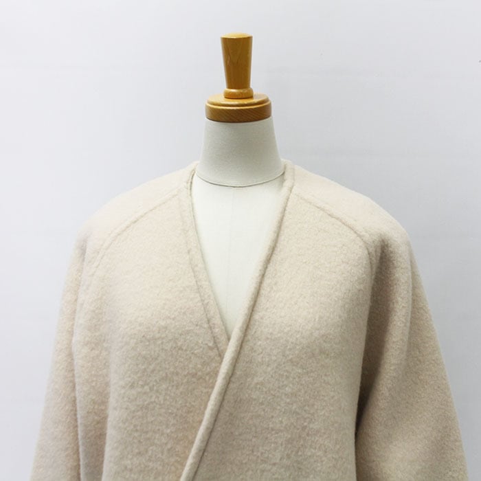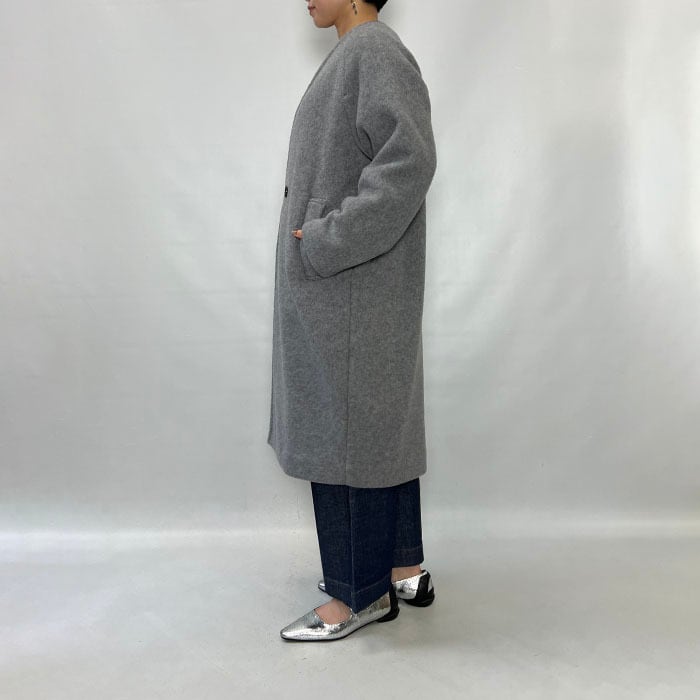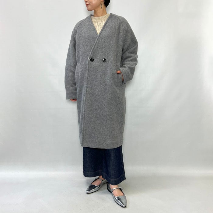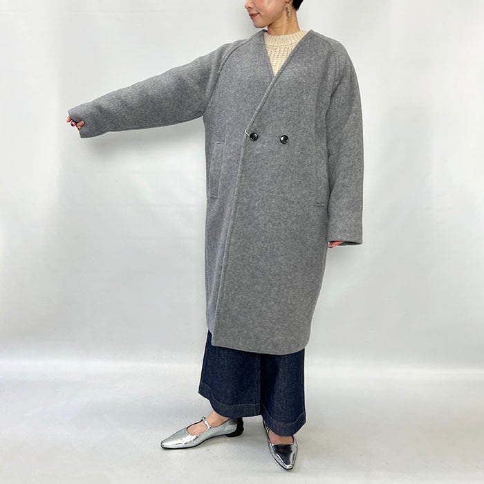 ゆったりとしたフォルムながらも、前合わせのダブル仕様が全体をすっきりと引き締め、上品で洗練された印象です。