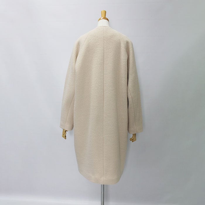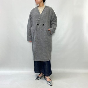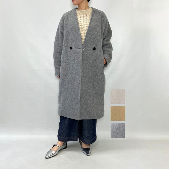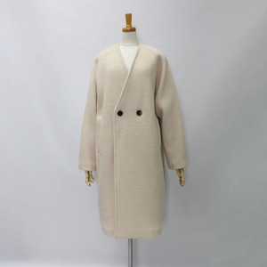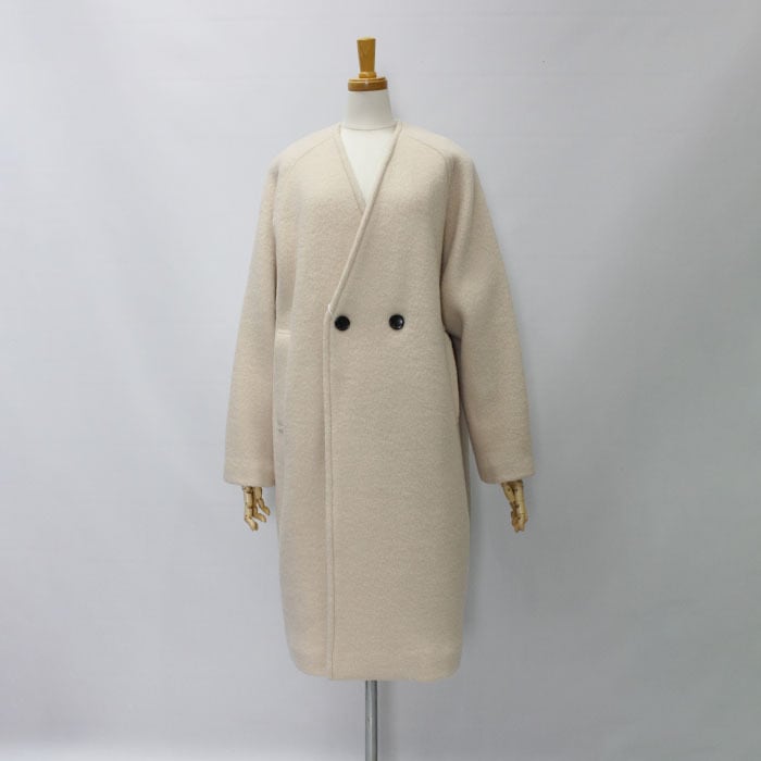 襟を省いたミニマルなデザインが印象的な、ダブルブレスト仕様のバルキーコート。