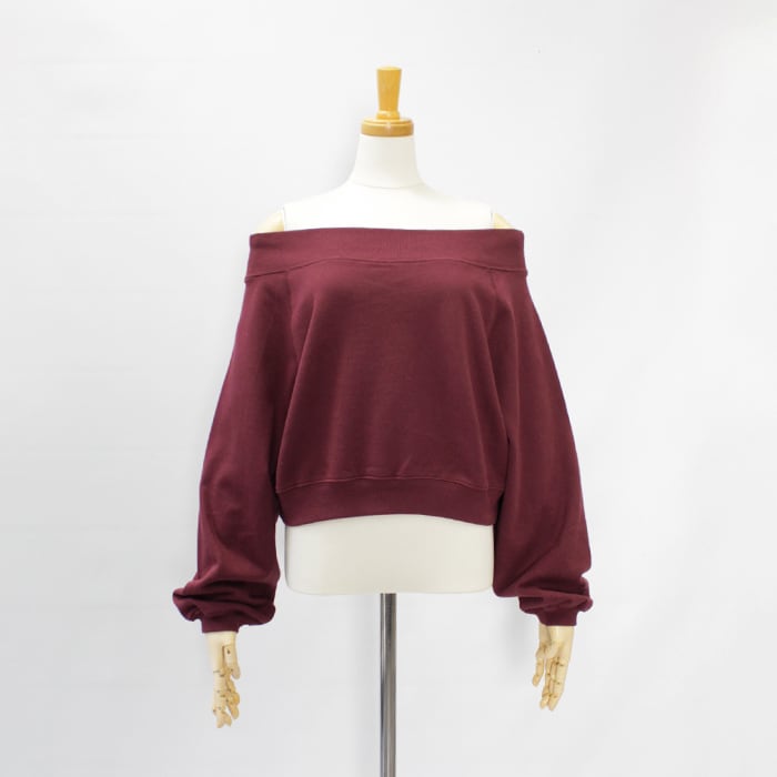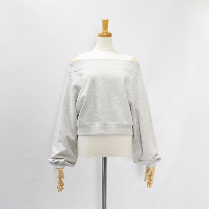 カジュアルなスウェット素材とトレンドのオフショルデザインが程よい女性らしさを演出。