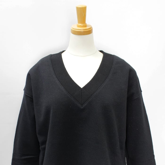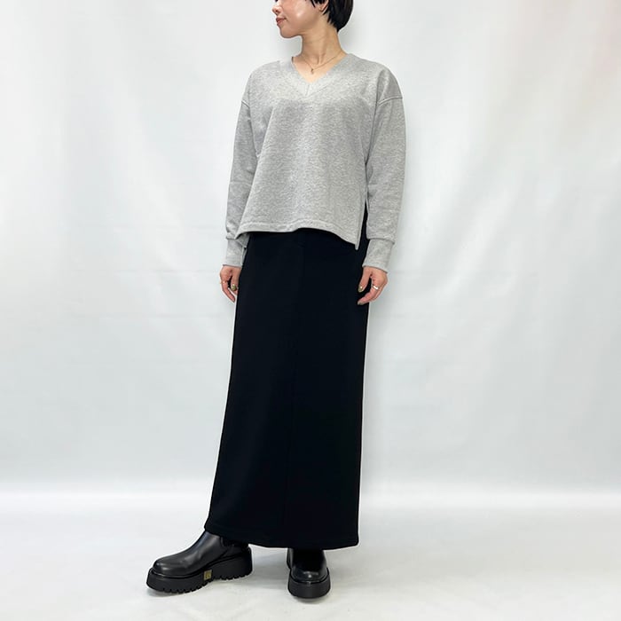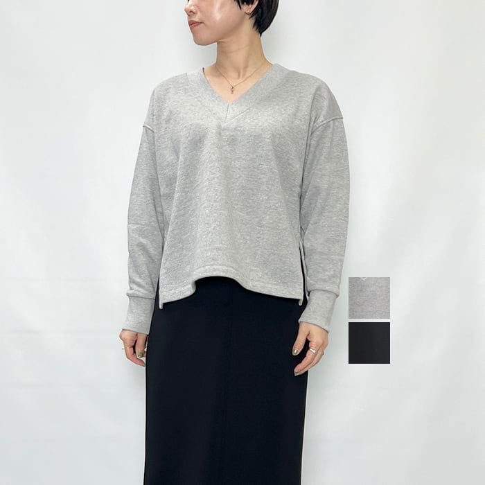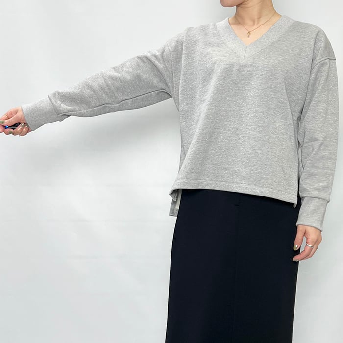 Vネックでデコルテを美しく見せ、両サイドのスリットで抜け感を出しています。