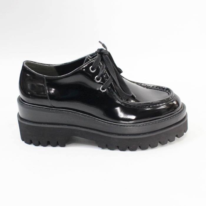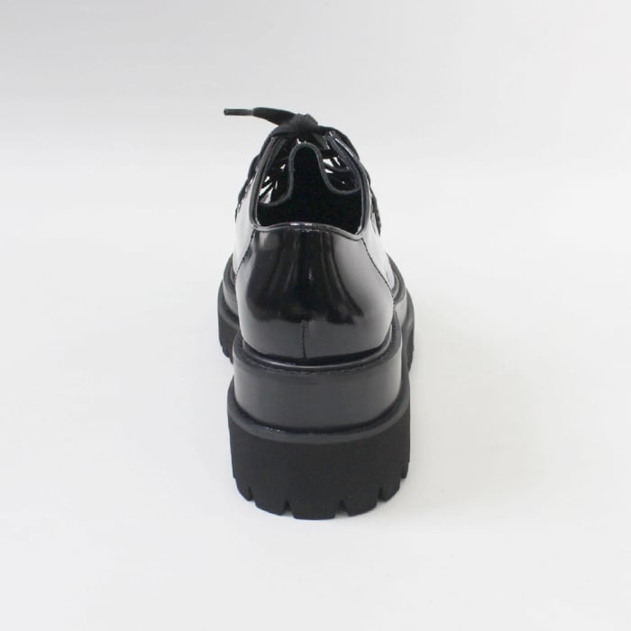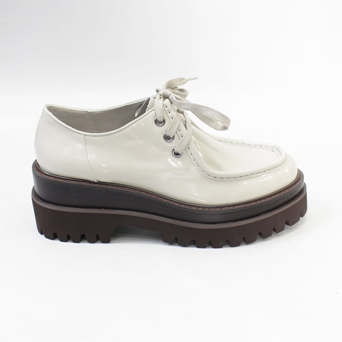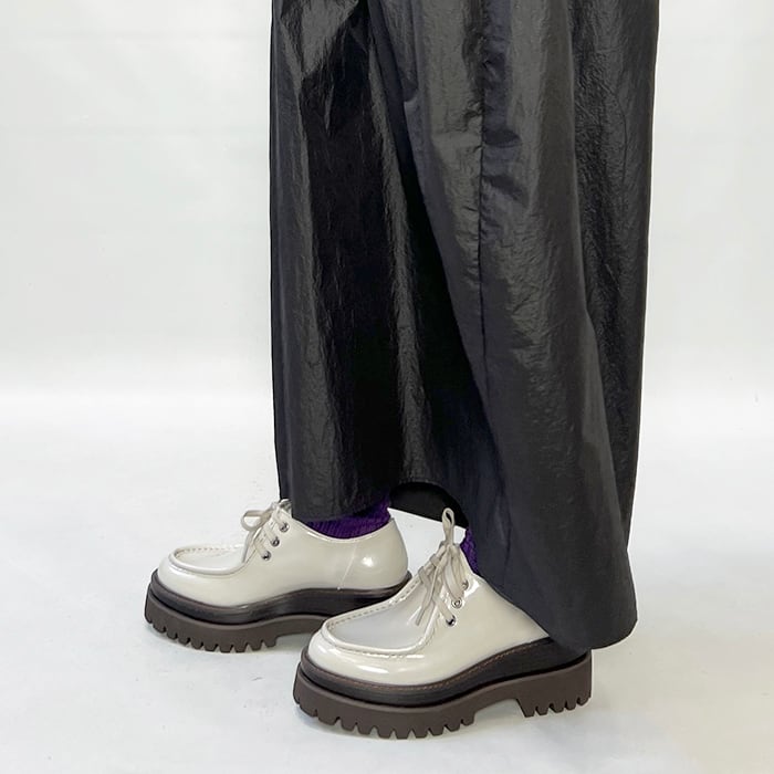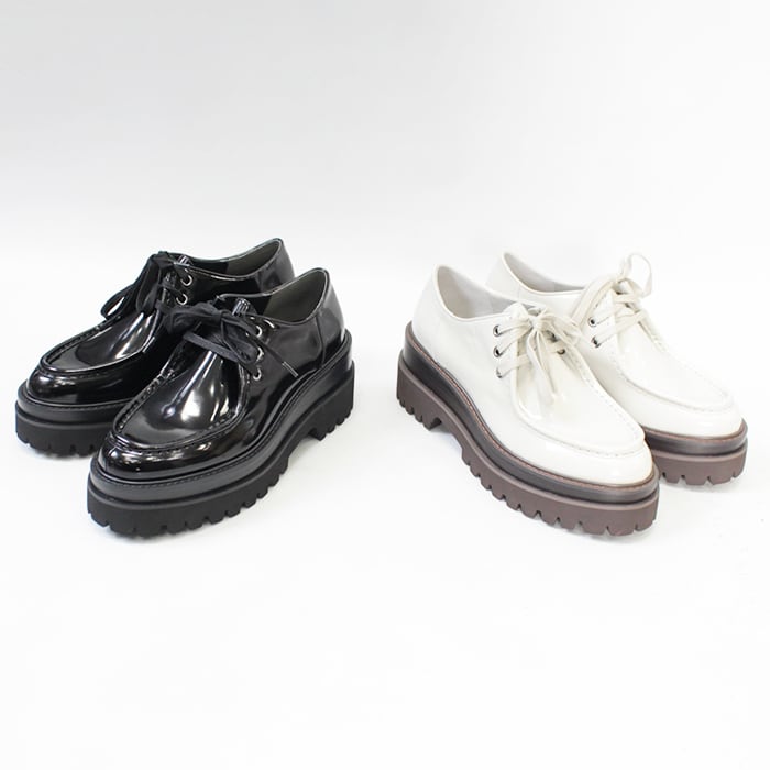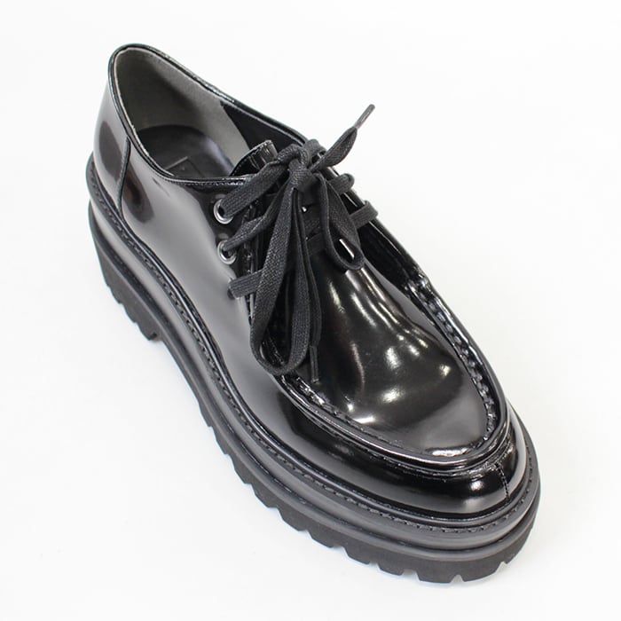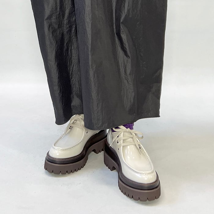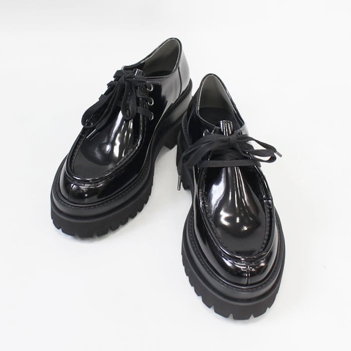 重厚感のあるフォルムながら光沢のあるレザーが足元を女性らしく演出します。