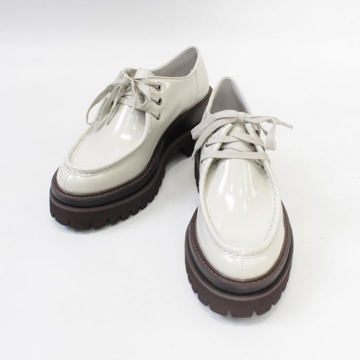 ブリティッシュテイストのかっちりとした紐靴に、トレンドのチャンキーヒールを合わせた今年らしい一足。