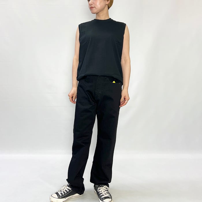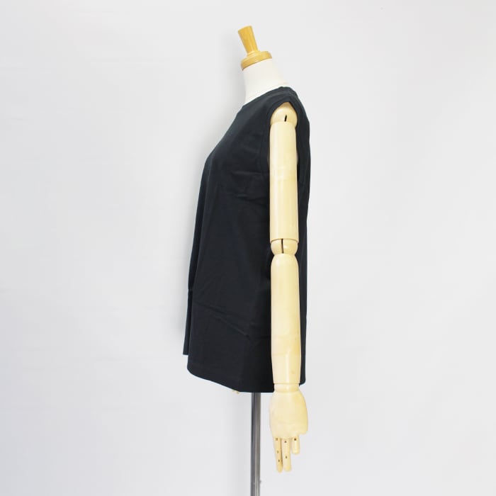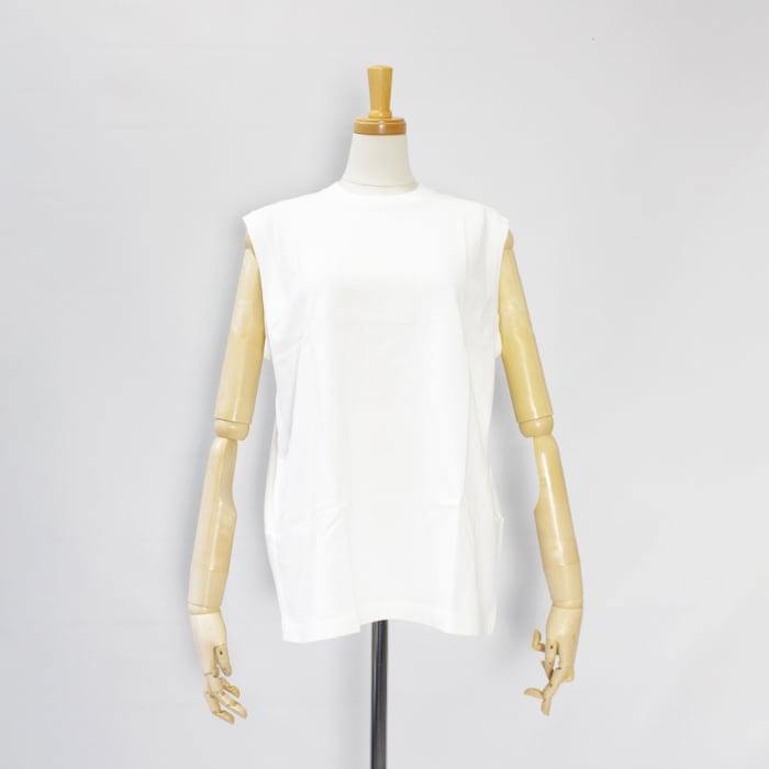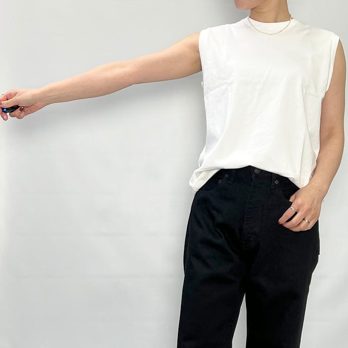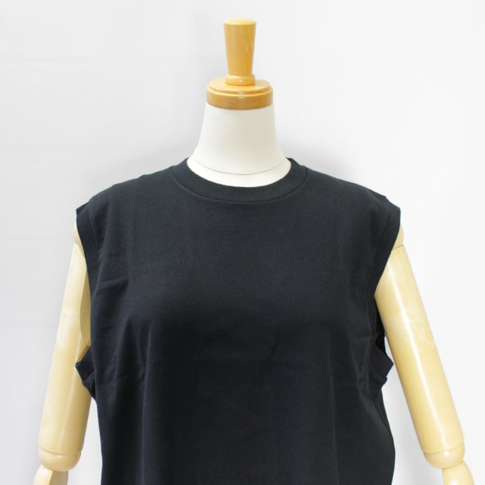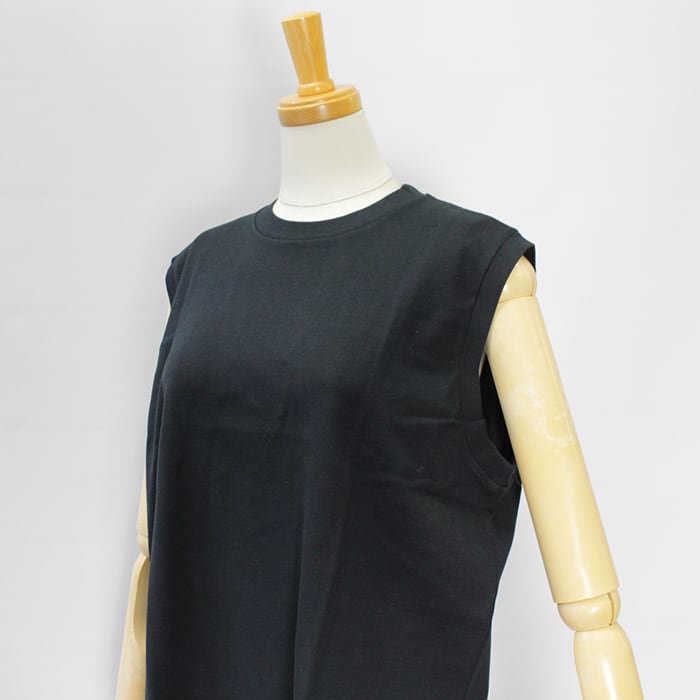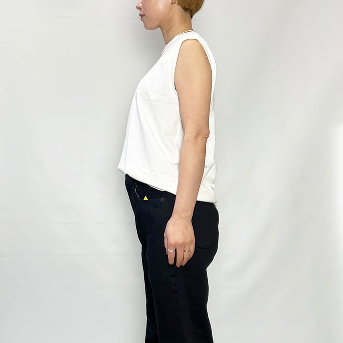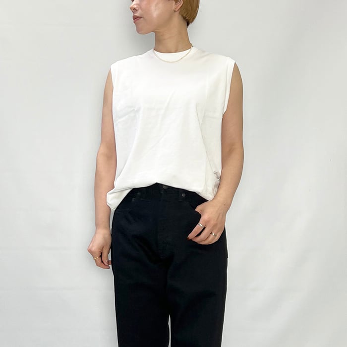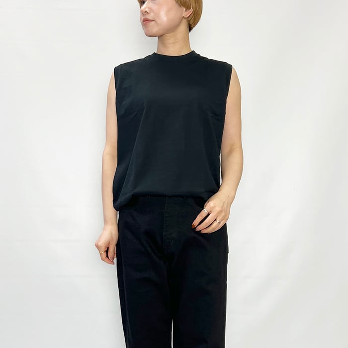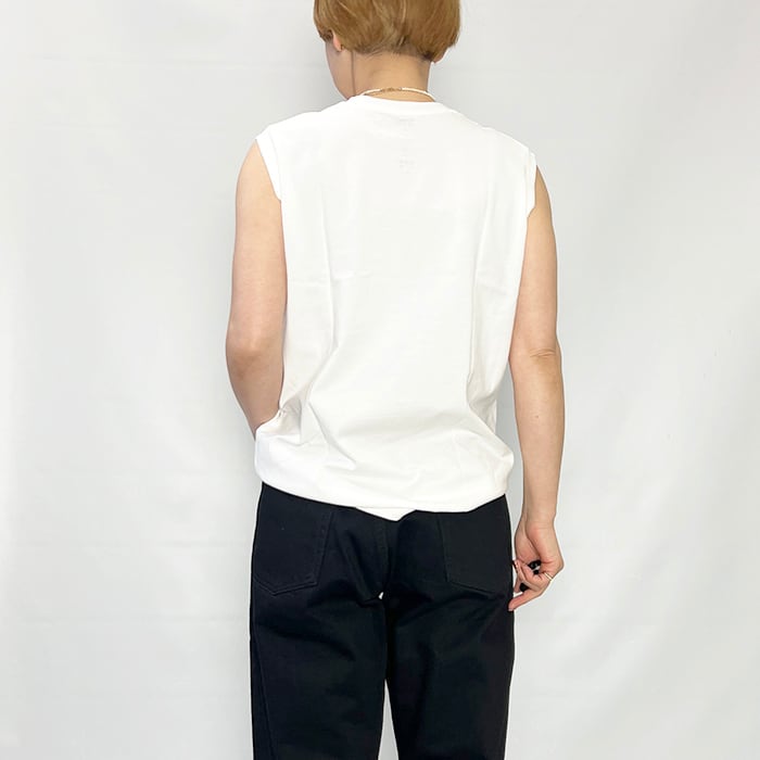 2パック半袖Tシャツと同じく糸の毛羽立ちを除去した天竺を使い、通年を通して活躍するノースリーブを作りました。