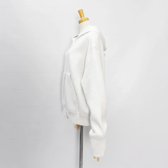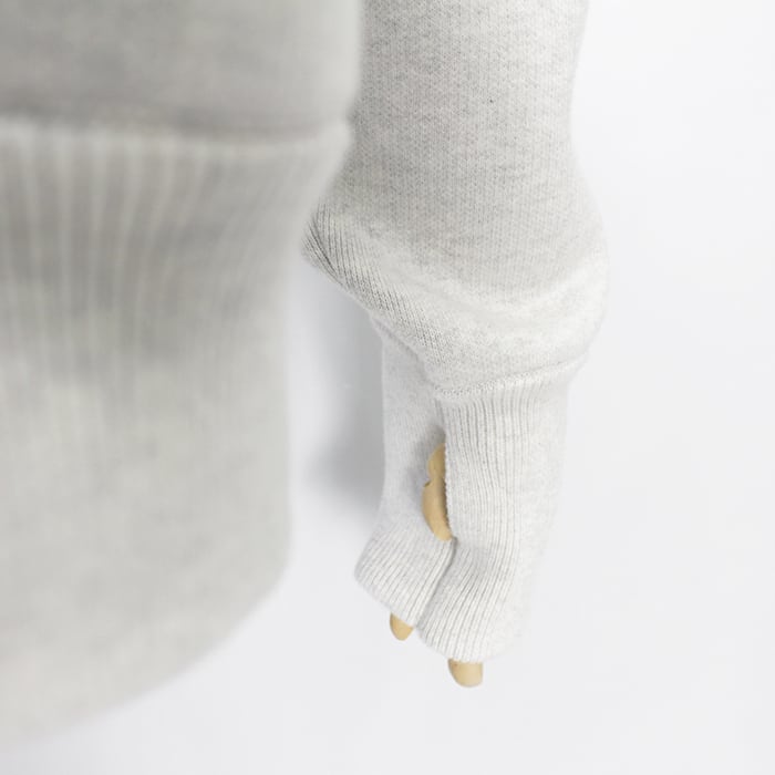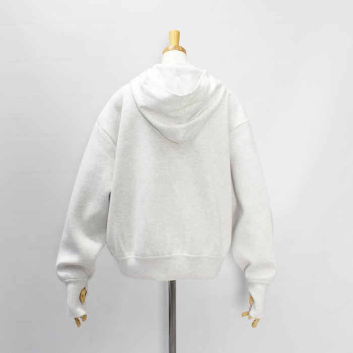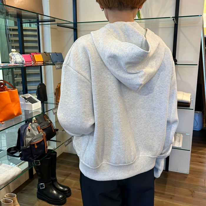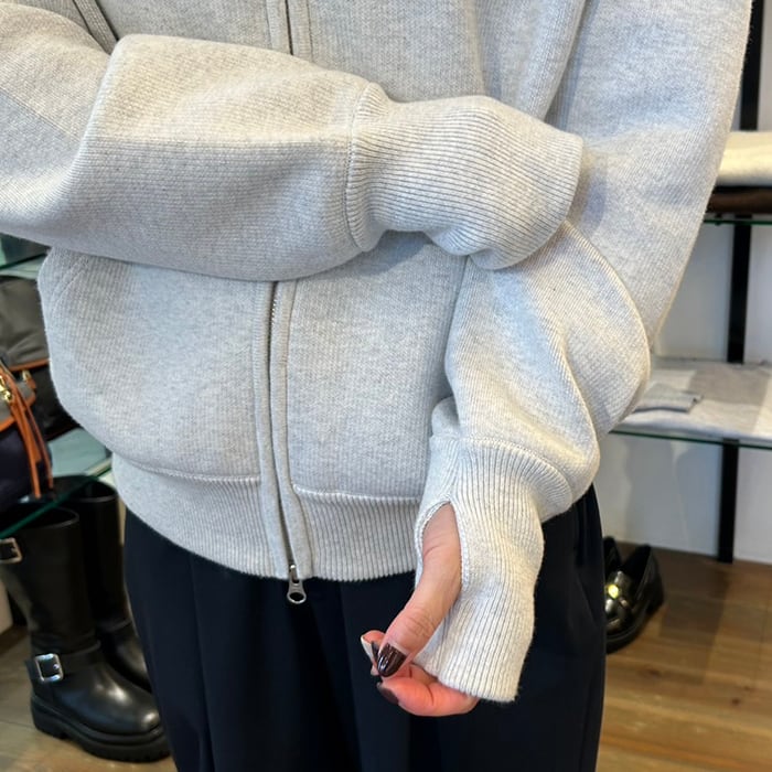 ニット表が綿/カシミアの糸、裏は膨らみを出すためにポリエステルの糸を使って接結編みをしているニットはニットとは思えない張りが出ることでシルエットが立体的に出るように仕上げました。