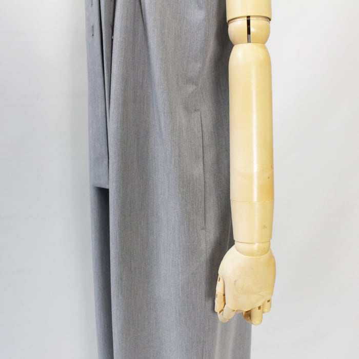 フロントのダブルタックと肩紐の垂らしデザインに金ボタンがアクセント。