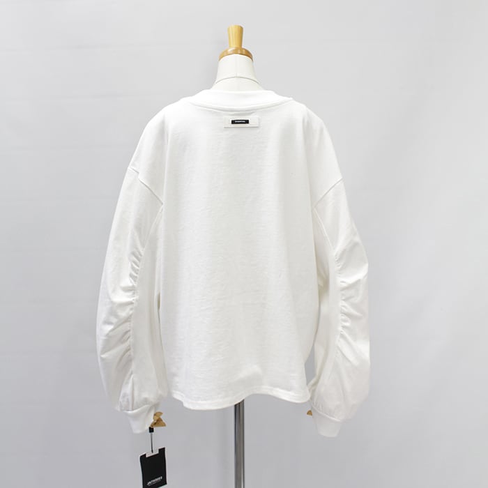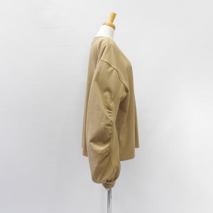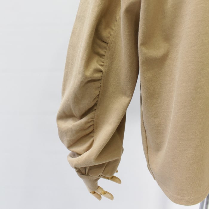 袖に施したギャザーがさりげないアクセントとなり、ゆったりとしたシルエットがリラクシンなムードを演出します。