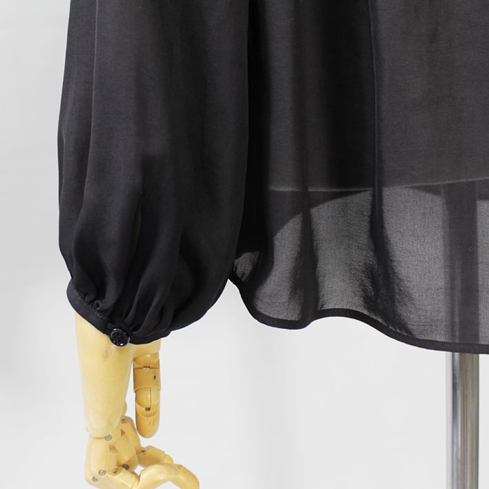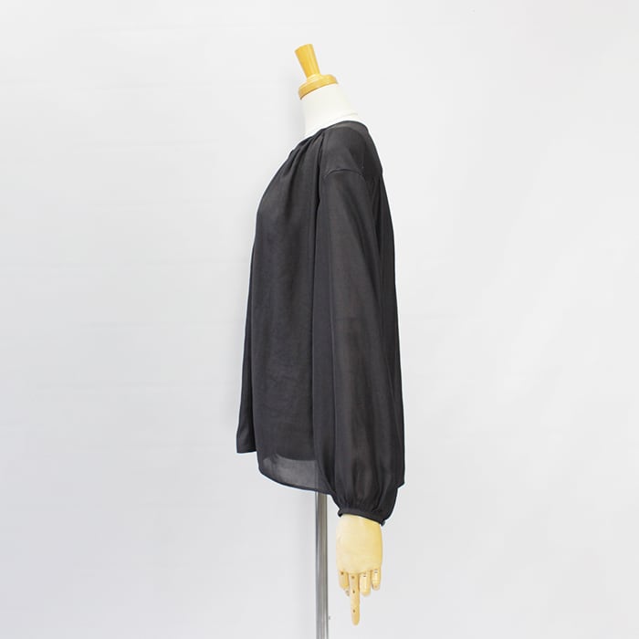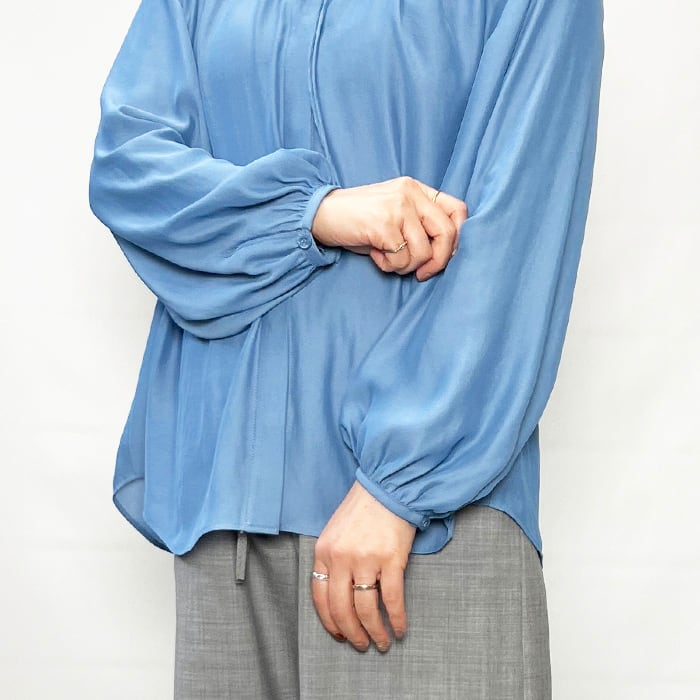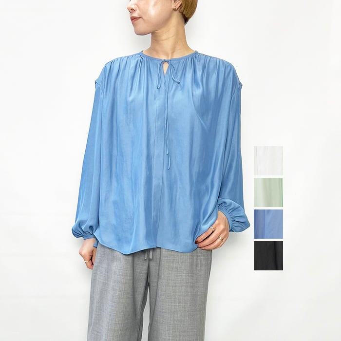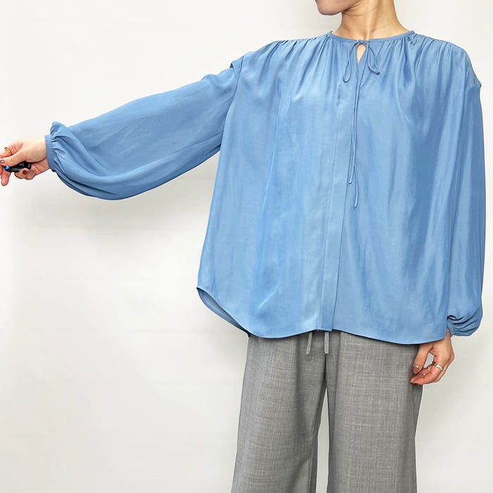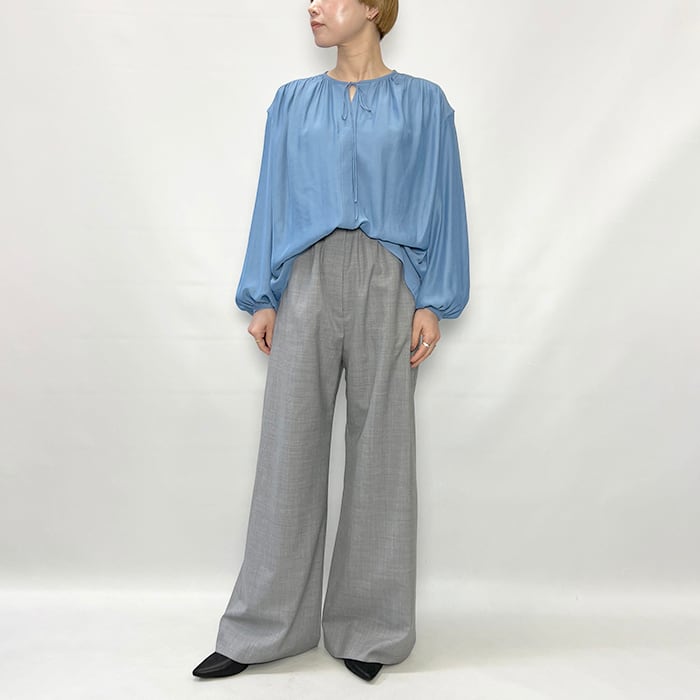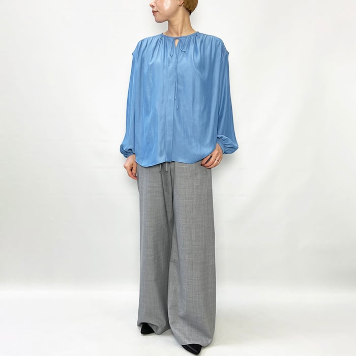 スタイリングに女性らしい抜け感を演出するギャザーブラウス。