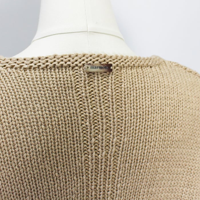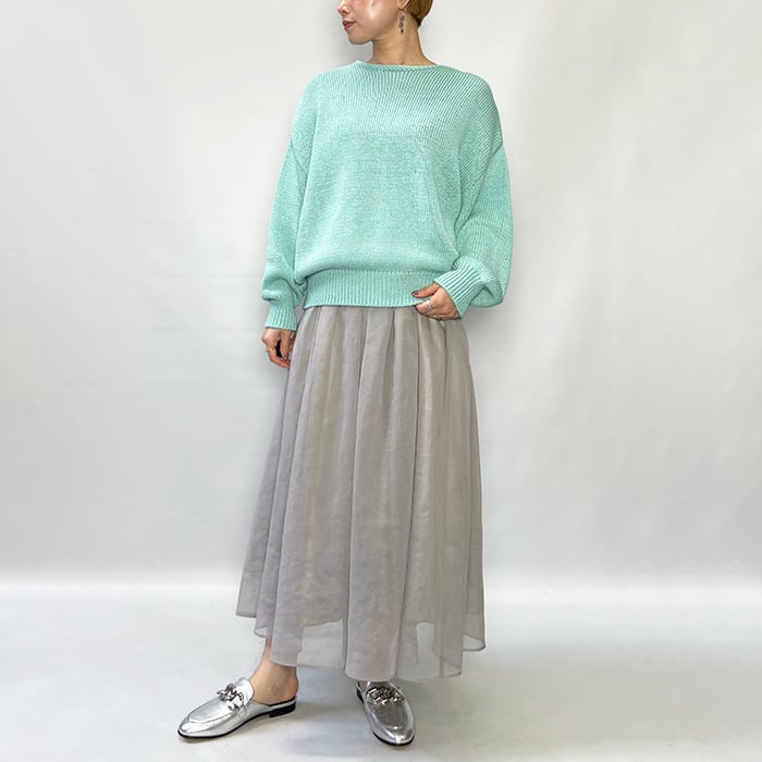 ITALYのテープ糸で、その特徴的な形状によりきしめんのような糸が不規則にねじれたりすることで、編んだ面が自然にランダムな表面感を見せてくれるニット。