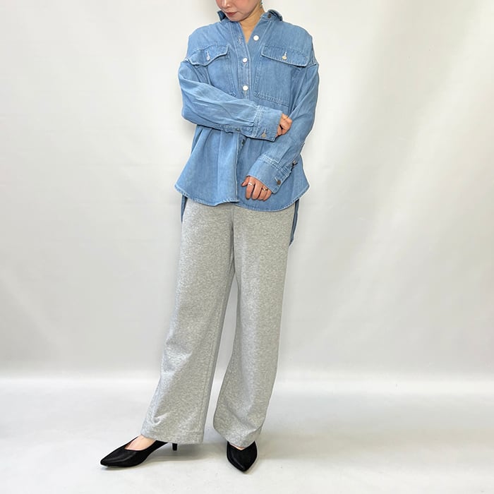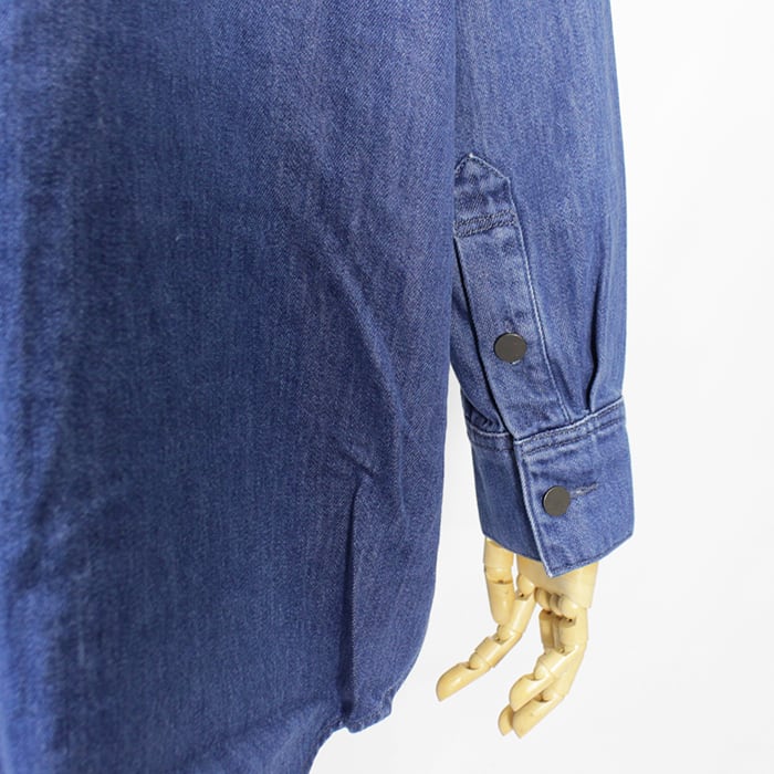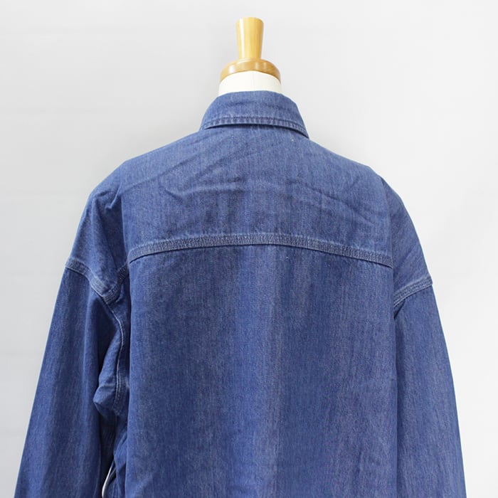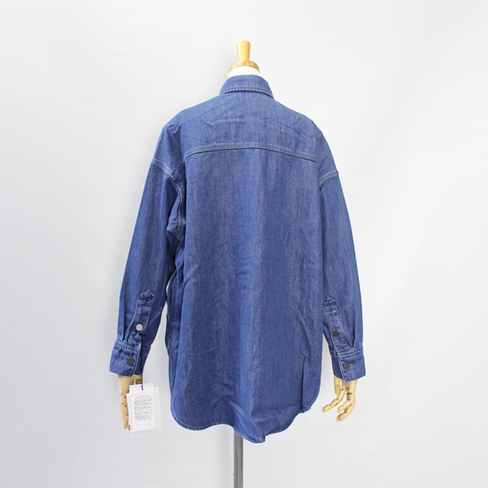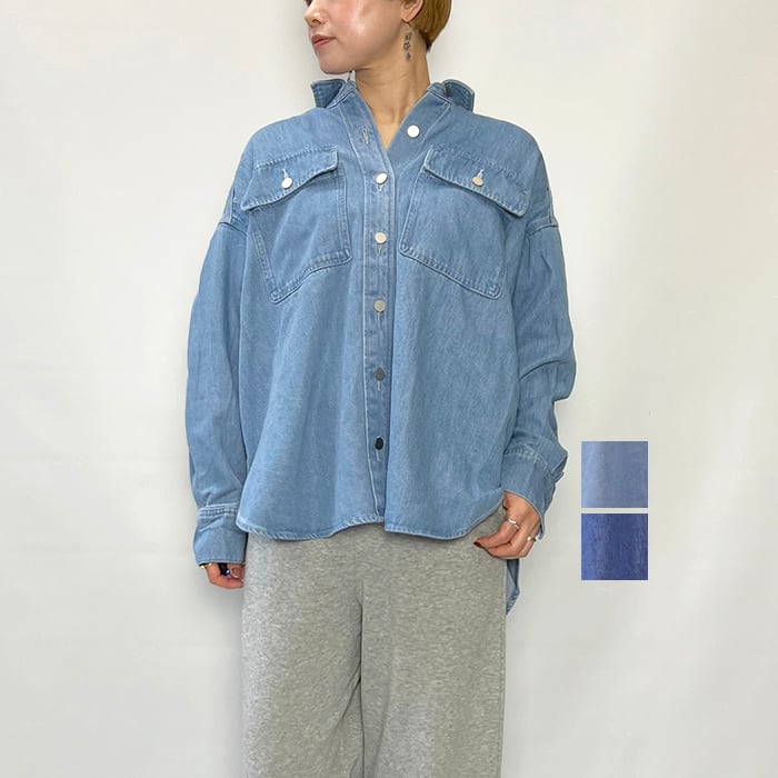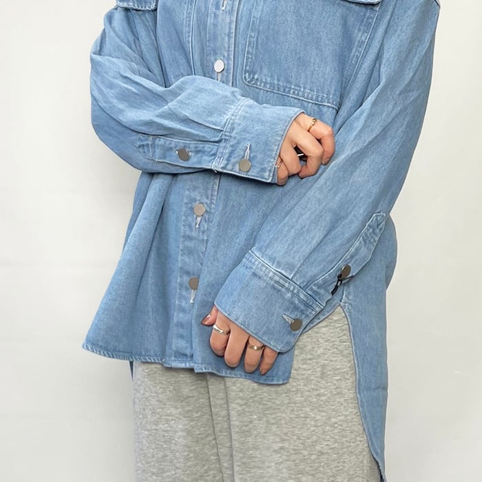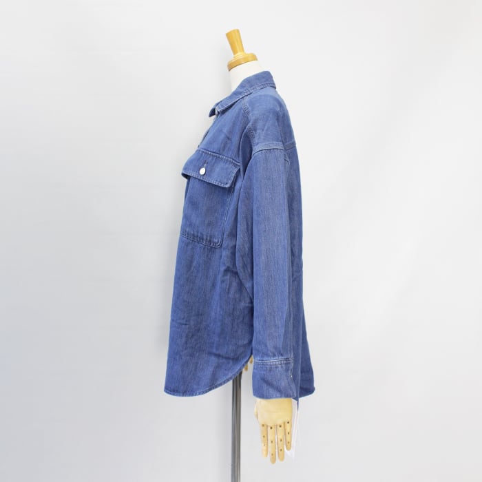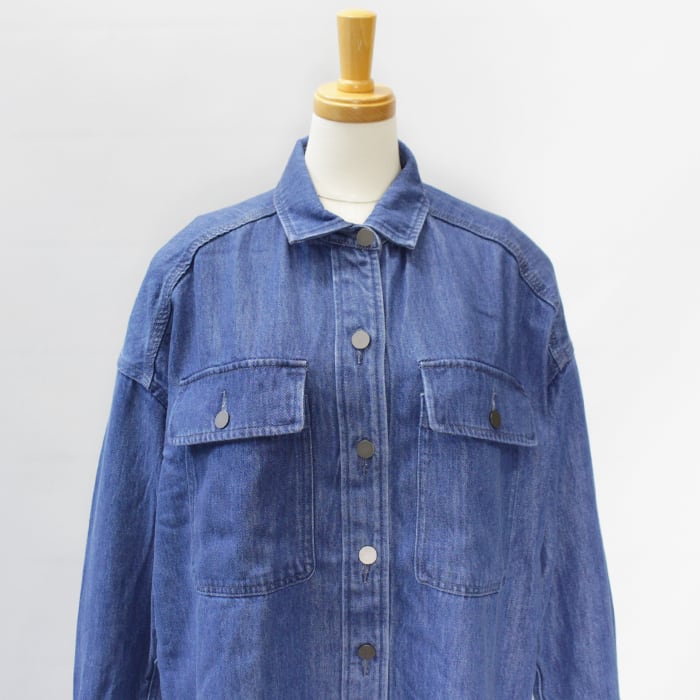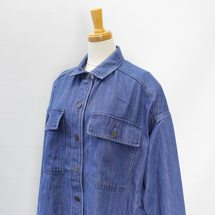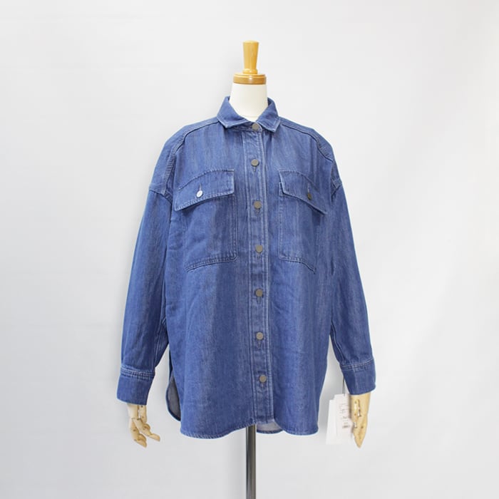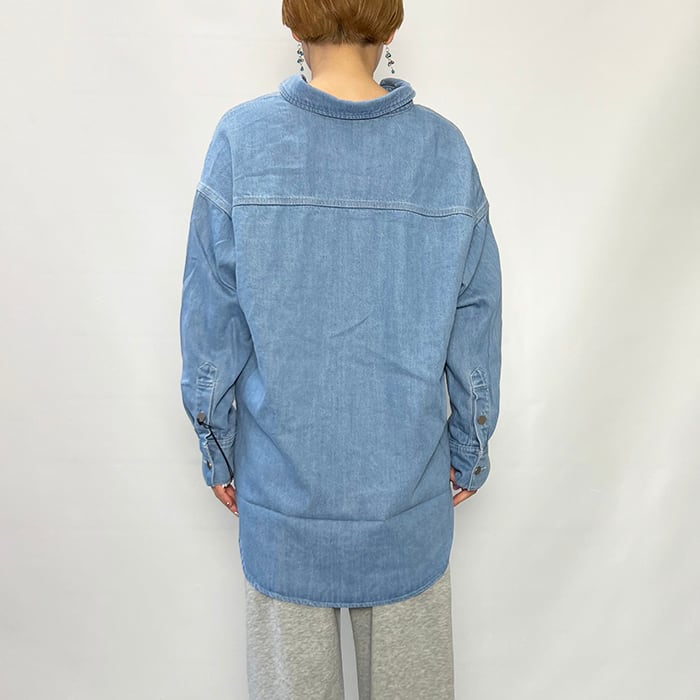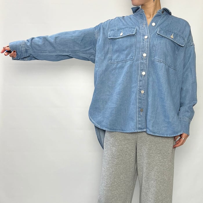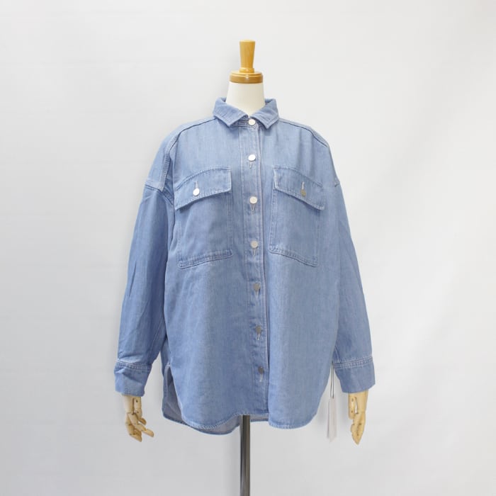 ゆとりのあるサイズ、ヒップが隠れる丈で、カジュアルなスタイリングに活躍するデニムシャツです。