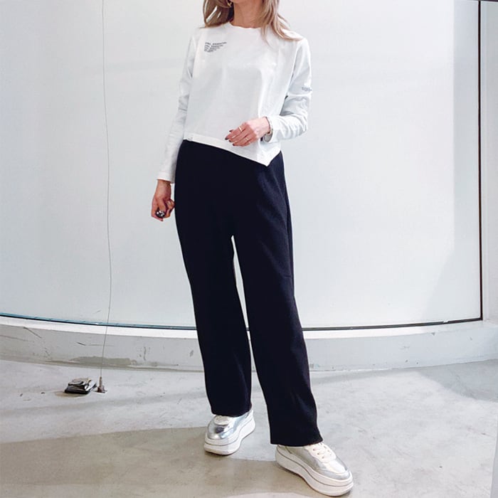 コーディネート全体にメリハリが出るので、ロンTでもすっきりときれいめに着こなすことができます。